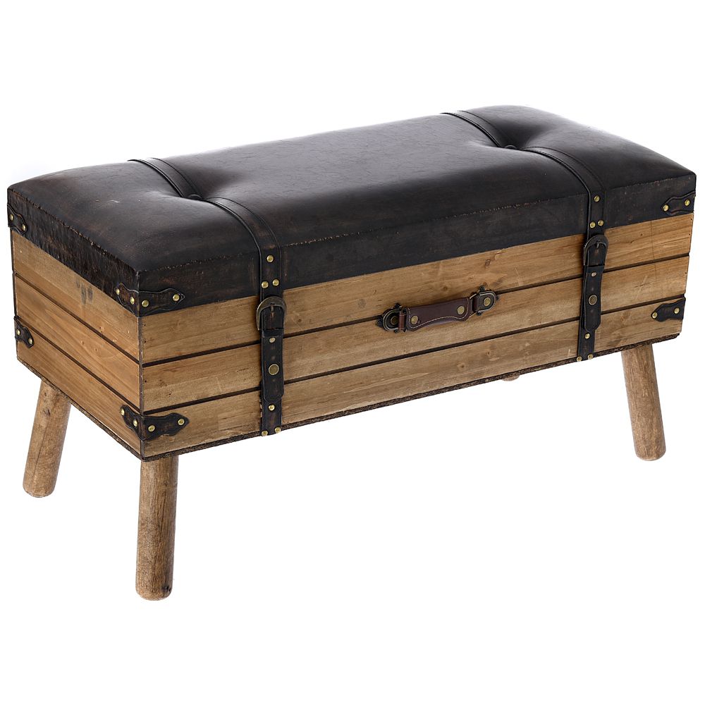 Интериорна дървена пейка с място за съхранение, имитираща куфар от кафява еко кожа с колани като закопчалки и завършващи детайли по ъглите.