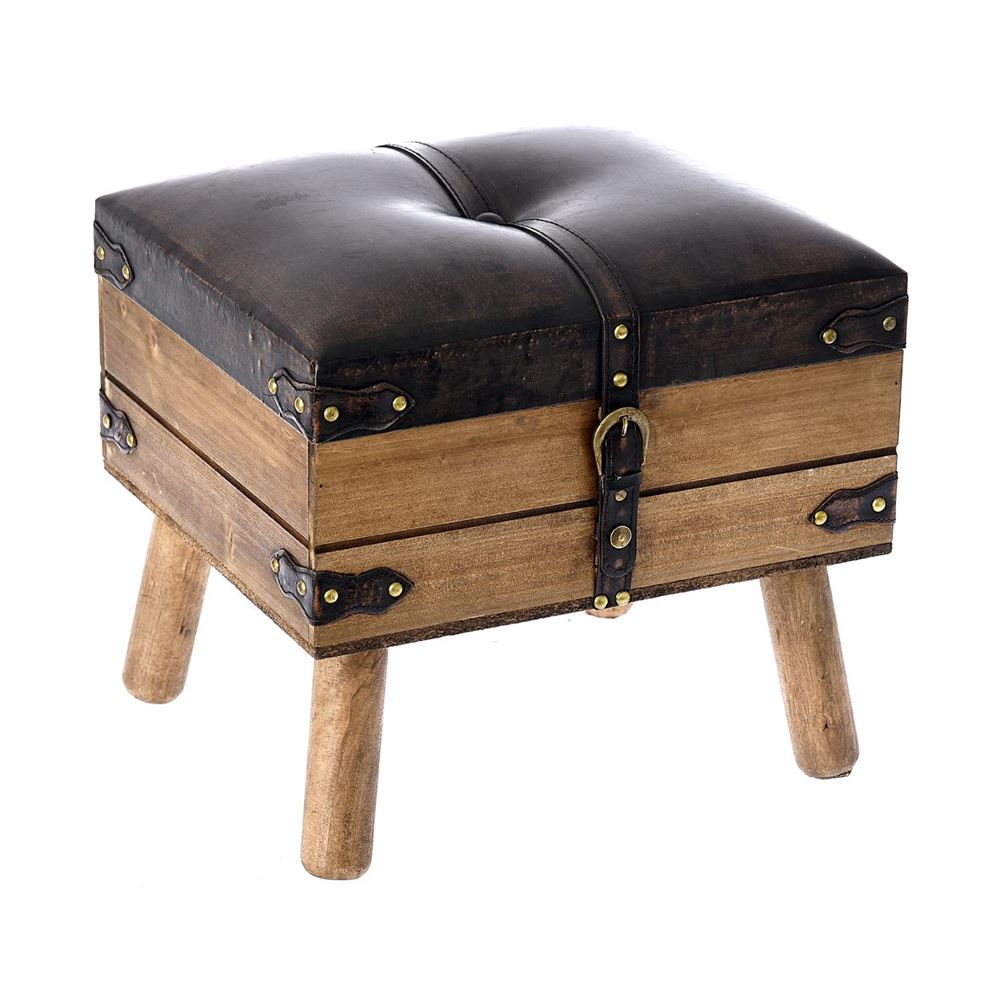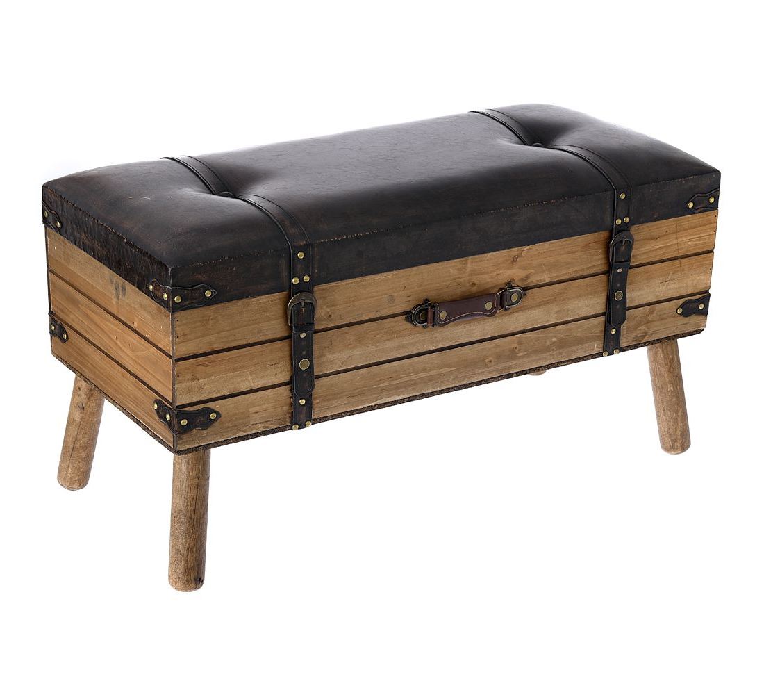 Дървена табуретка с място за съхранение, имитираща куфар от кафява еко кожа с колани като закопчалки и завършващи детайли по ъглите.