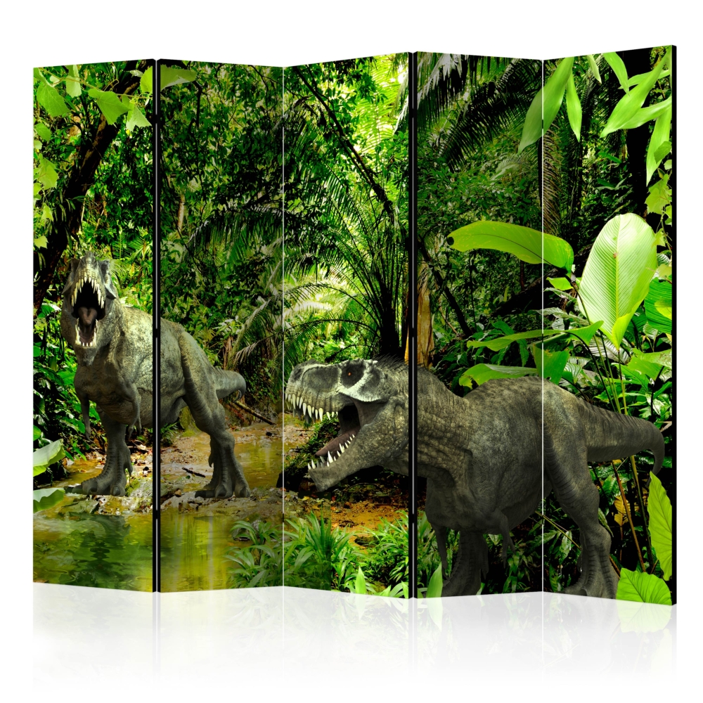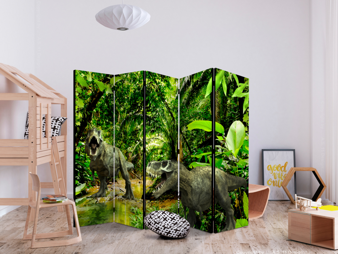 Този декоративен параван с динозаври в джунгла е оригинална декорация за всеки съвременен интериор. Състои се от 5 части, изработен е от дърво и е с двустранен печат. Благодарение на оригиналния мотив с качество на печата Full HD, този параван ще придаде неповторим чар на всяко помещение у дома!