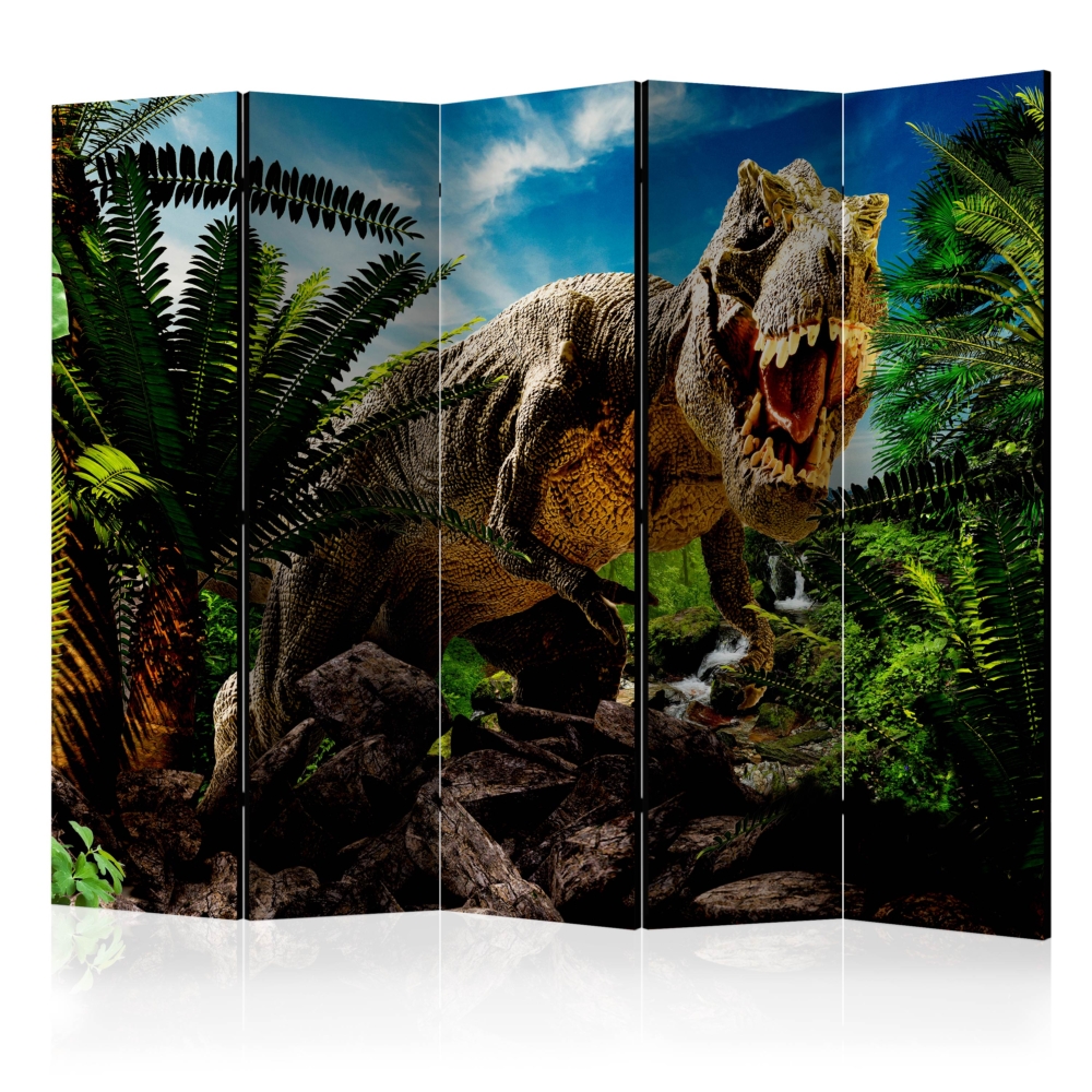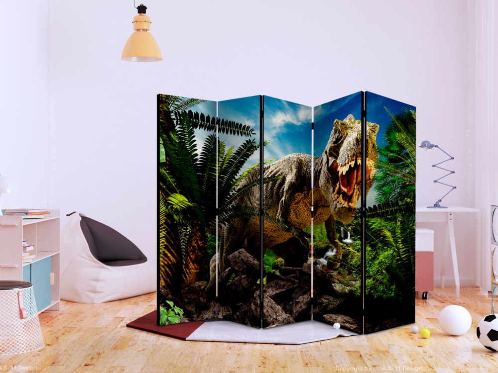 Този декоративен параван с тиранозавър в джунглата е оригинална декорация за всеки съвременен интериор. Състои се от 5 части, изработен е от дърво и е с двустранен печат. Благодарение на оригиналния мотив с качество на печата Full HD, този параван ще придаде неповторим чар на всяко помещение у дома!