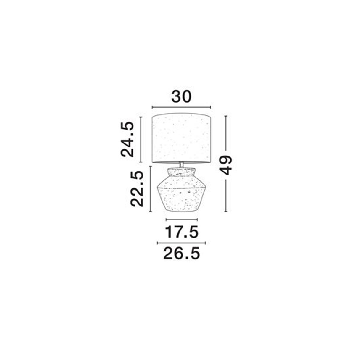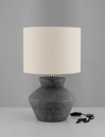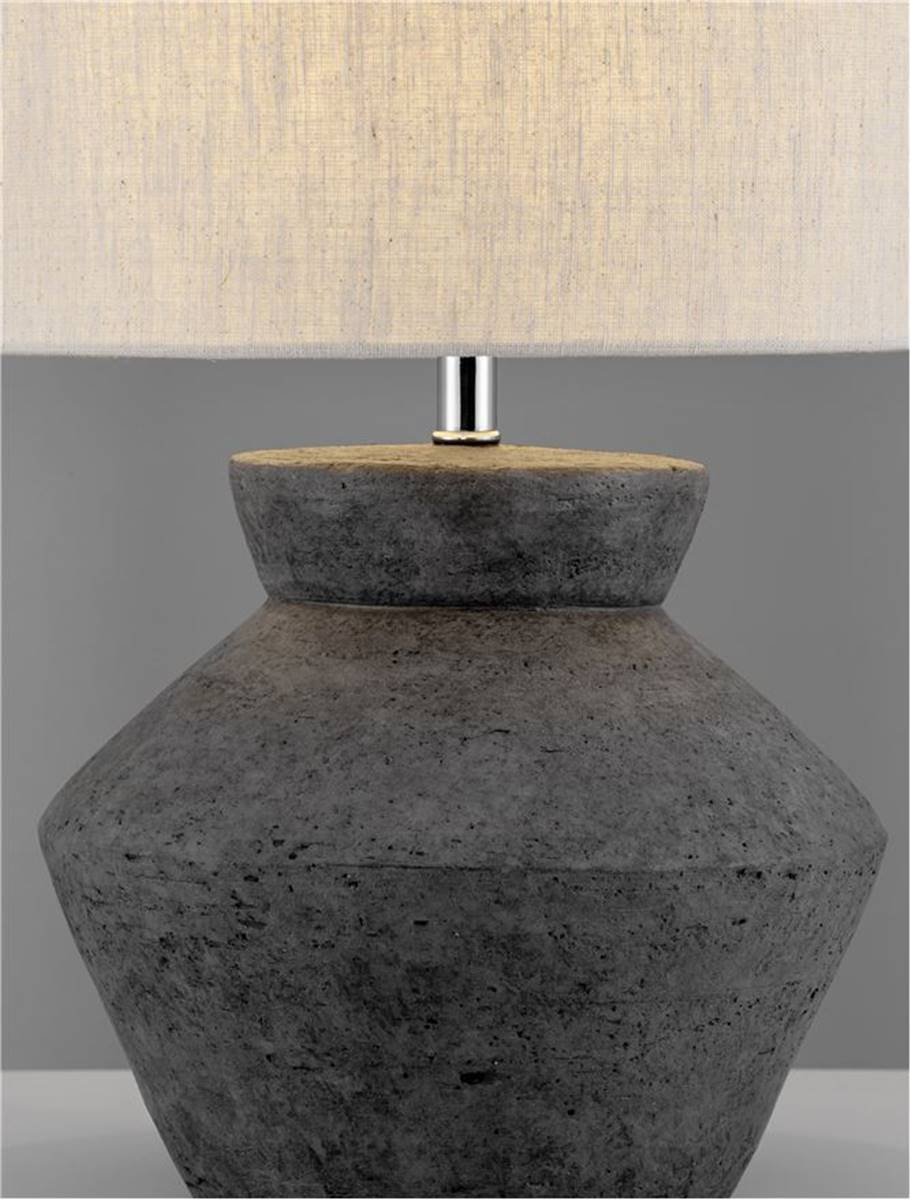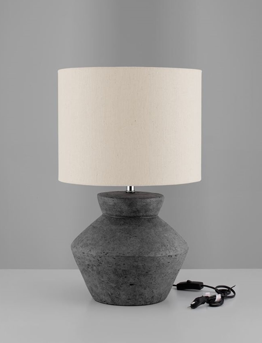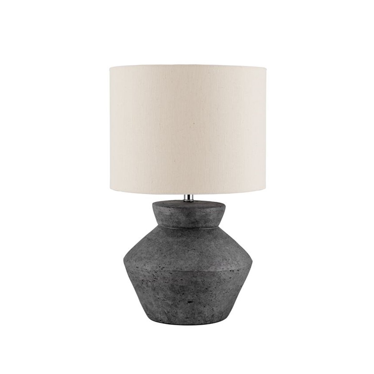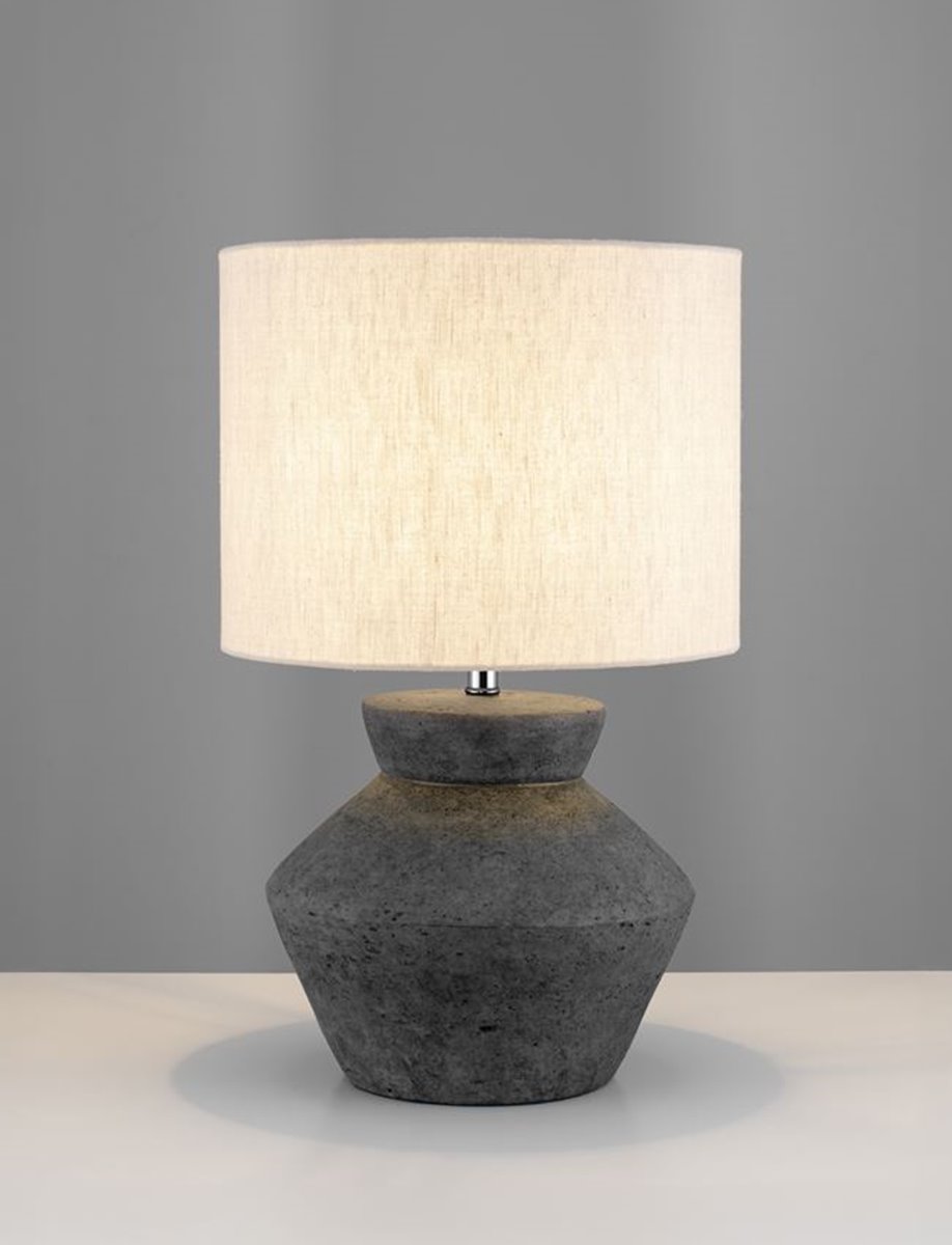 Декоративна настолна лампа с атрактивна геометрична основа, имитираща състарена керамика в тъмносив цвят. Класически светъл текстилен абажур допълва цялостната визия, като придава елегантност и балансира дизайна.