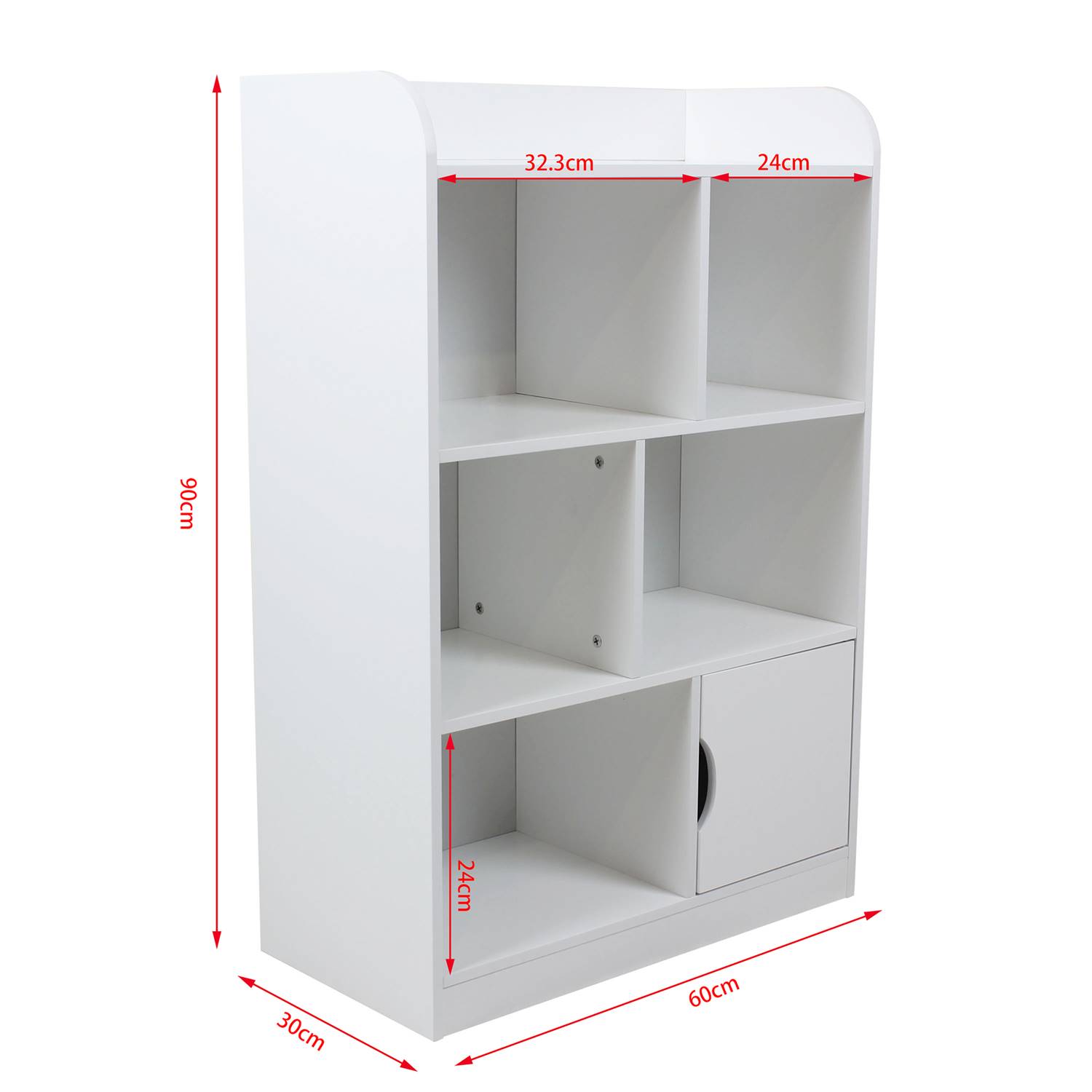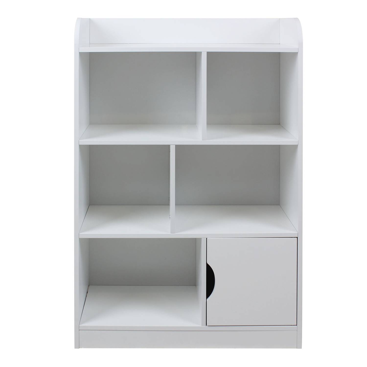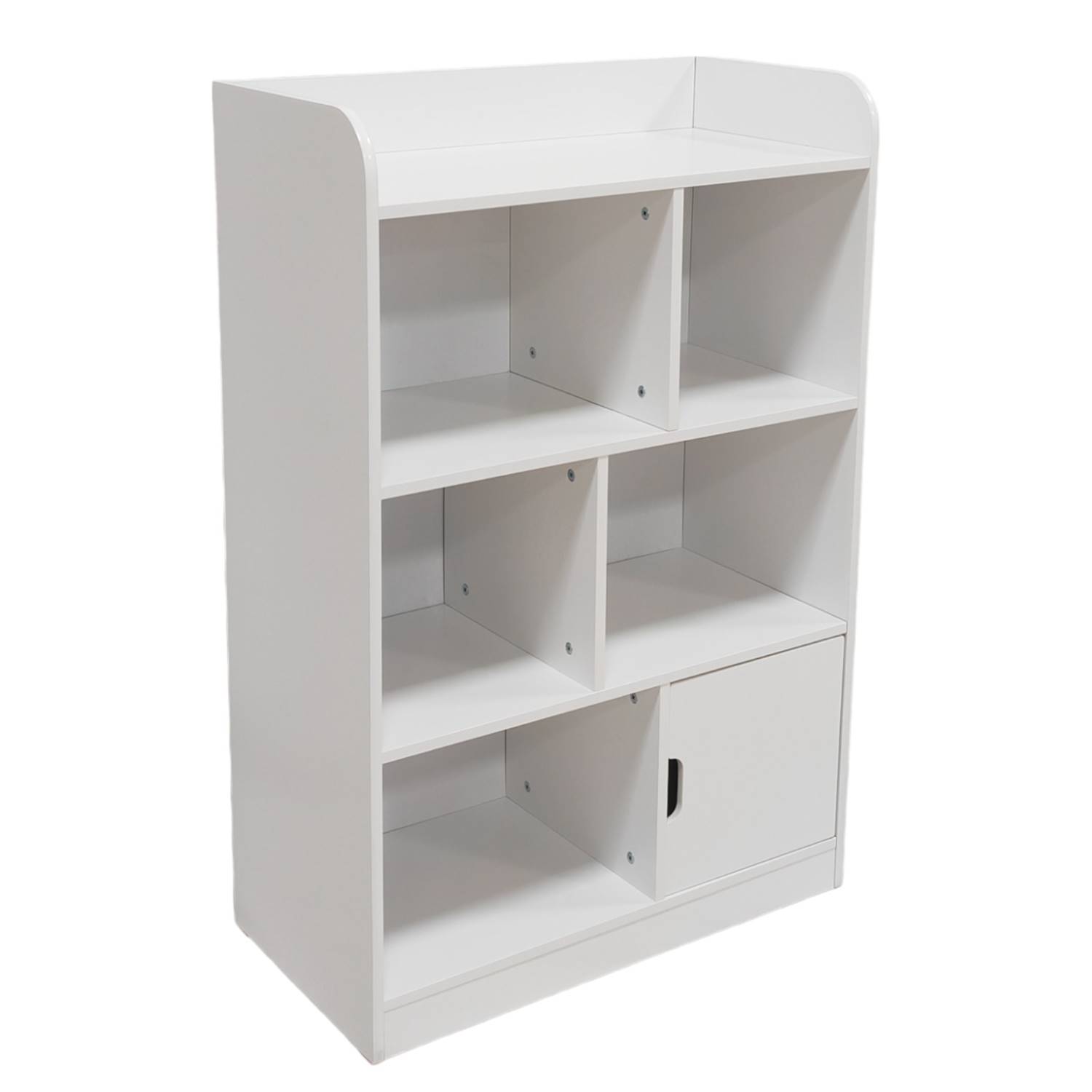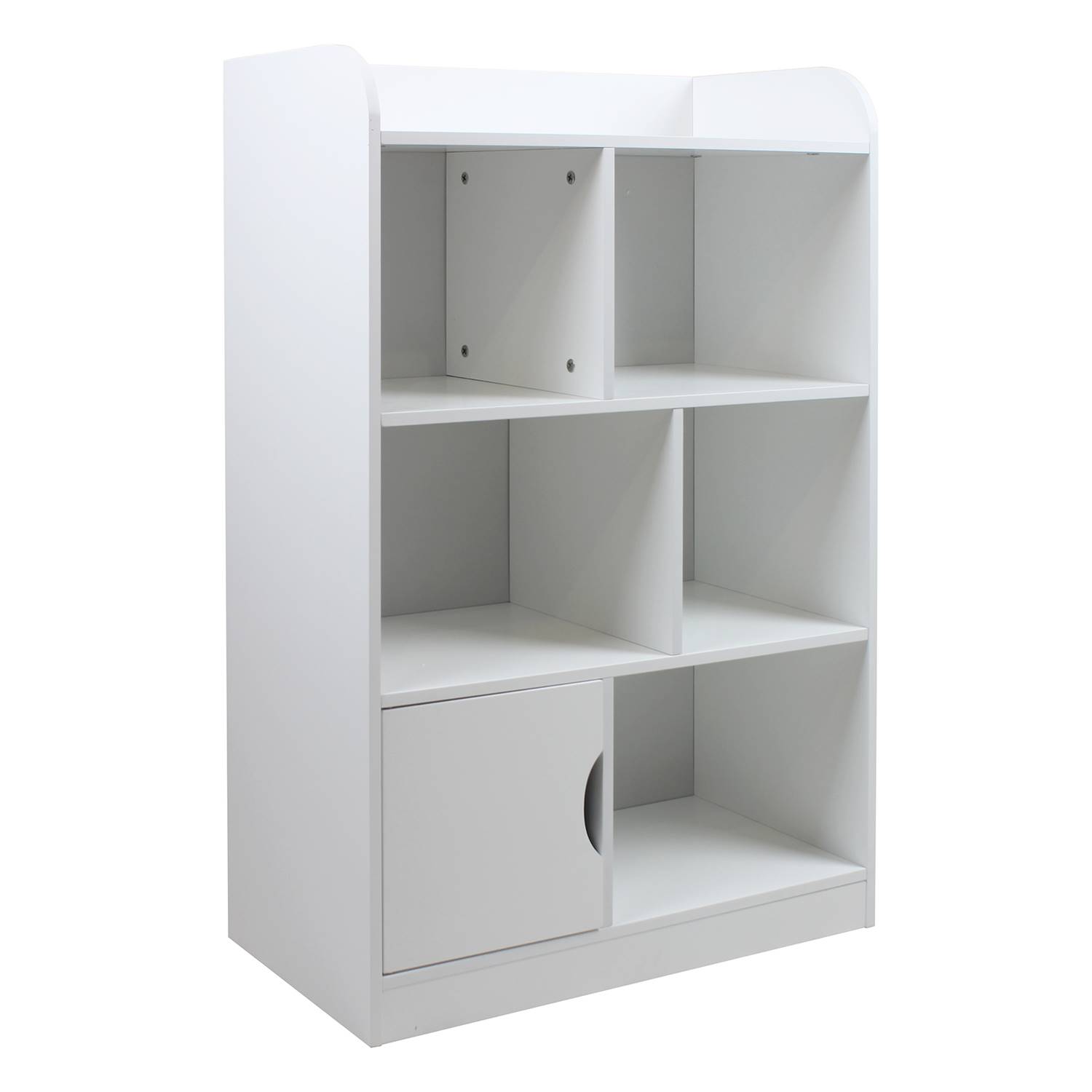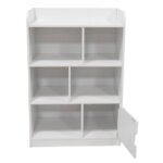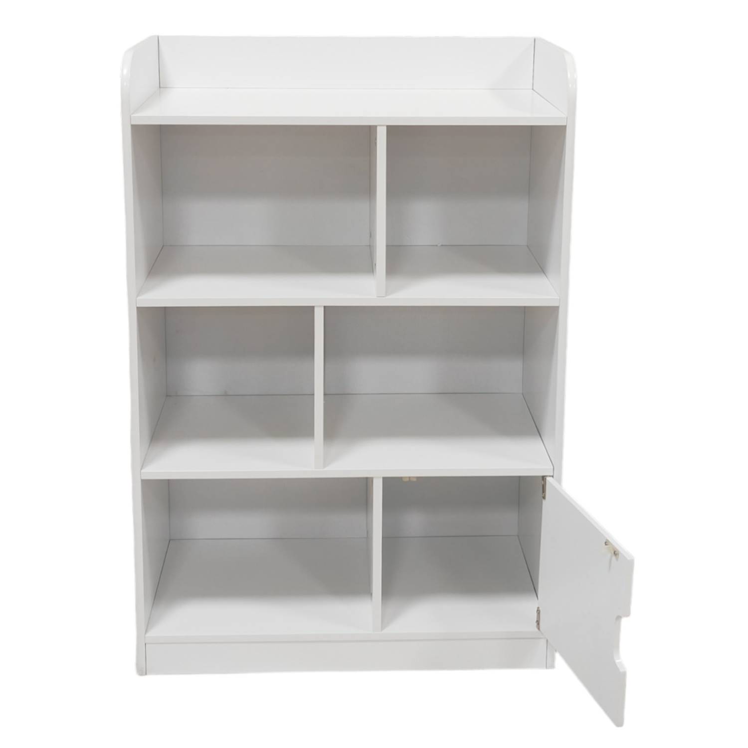 Практична и стилна детска етажерка в бяло, разполагаща с шест отворени рафта за лесен достъп и допълнителен рафт с вратичка за по-малки предмети – идеална за съхранение на книжки, играчки и любими вещи.