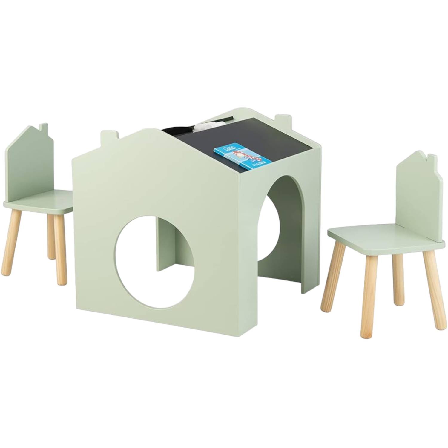 Масичката представлява мултиактивна къщичка, която служи като черна дъска за писане и рисуване. Децата могат да творят, пишат и изтриват безкрайно, което я прави идеална за ежедневна употреба. Просторният плот осигурява място за книжки, учебници и материали за рисуване, предоставяйки комфортно пространство за учене и игра.