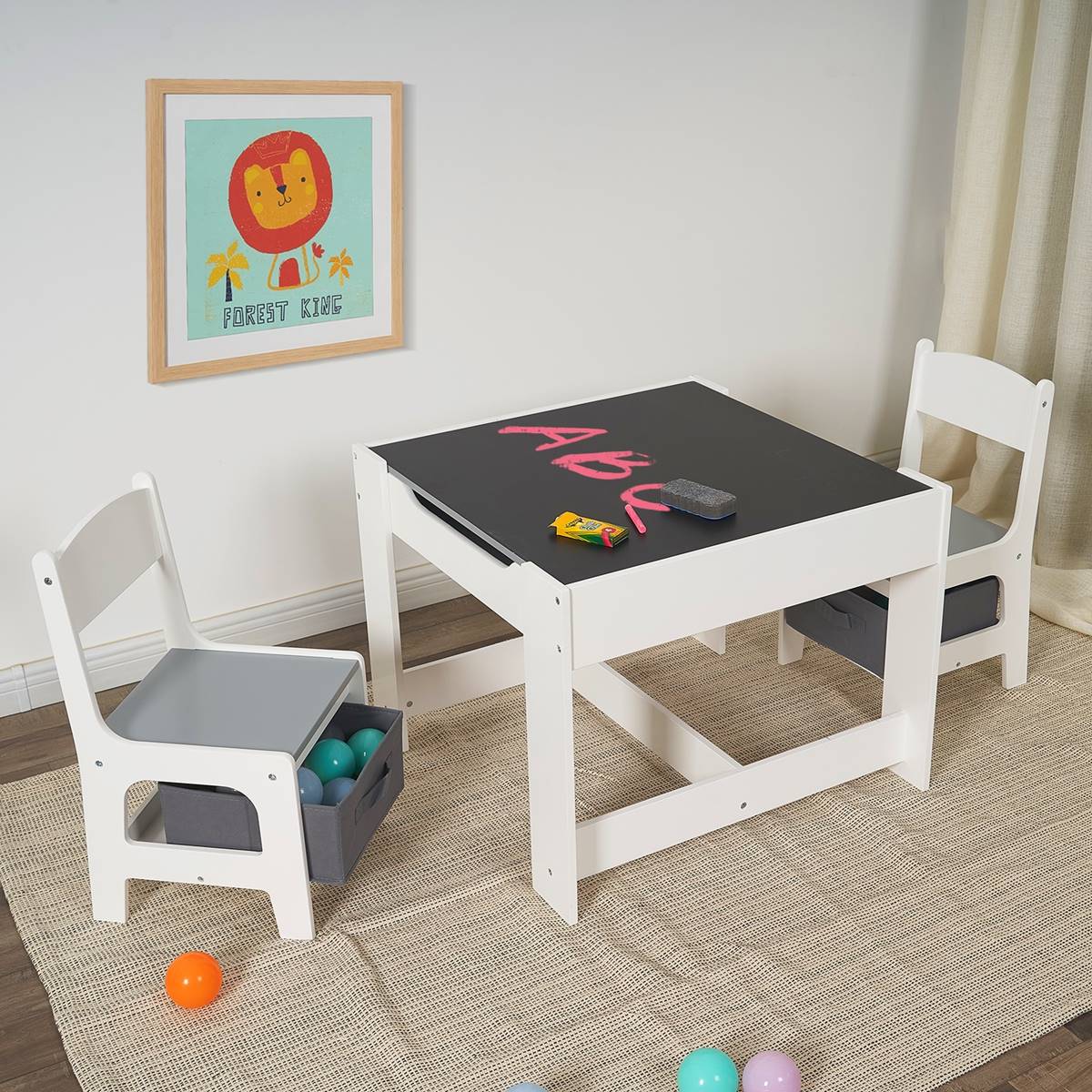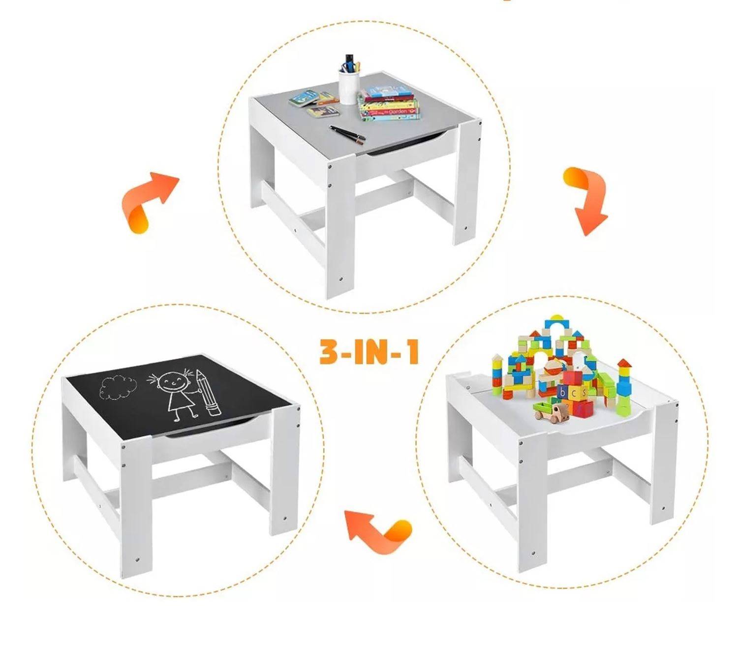 Детски комплект масичка със столчета 3 в 1 e перфектния подарък за всяко дете. Този многофункционален комплект в сиво и бяло предлага забавление и удобство, като съчетава креативност и практичност в едно.