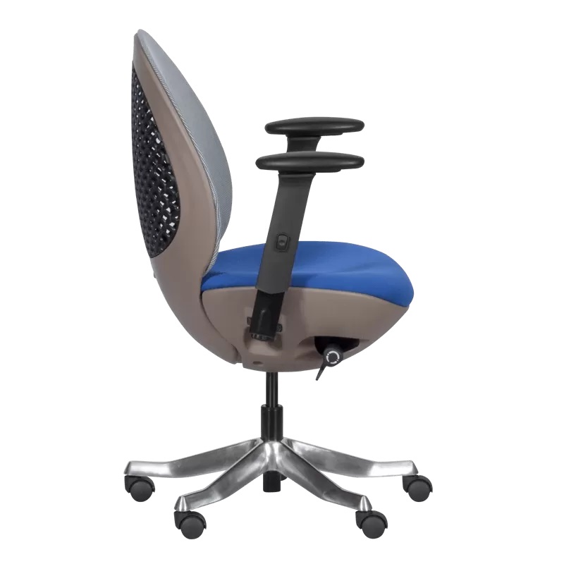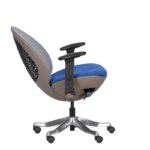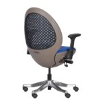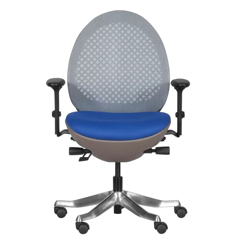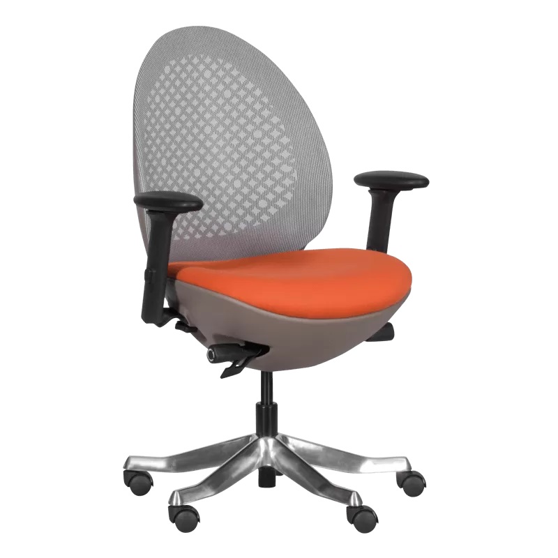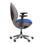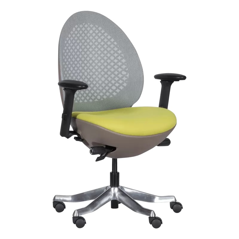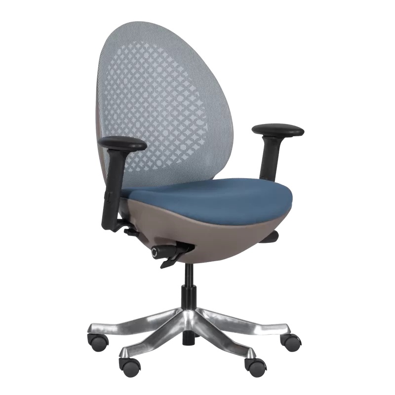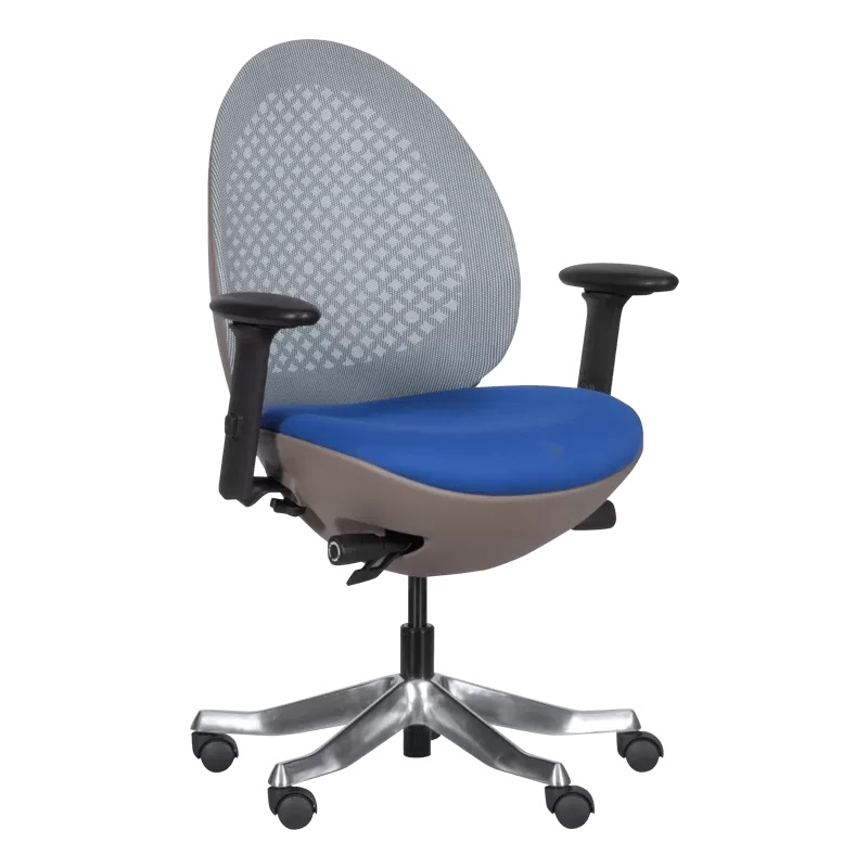 Детски офис стол с овална основа, люлеещ механизъм и подвижни подлакътници, които могат да се регулират по височина, напред, назад, да се завъртат под ъгъл и да се променя разстоянието между тях.