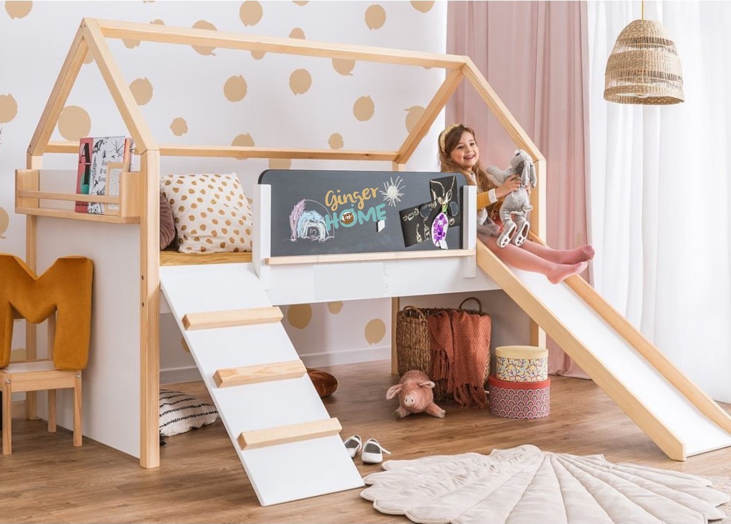 Детско легло къщичка с пързалка съчетава функционалност и забавление, осигурявайки на вашето дете удобство и радост всеки ден.