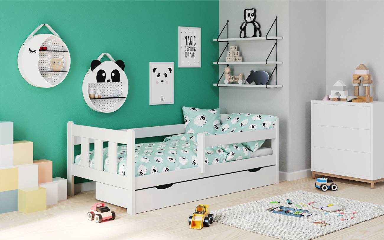 Дървено детско легло с преграда и издърпващо се чекмедже на колела, предлагащо се в два цвята – натурален и бял.