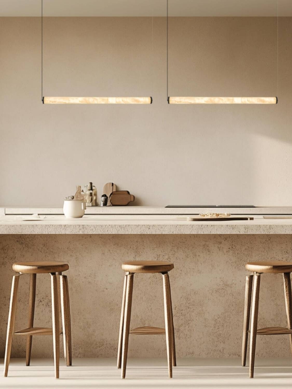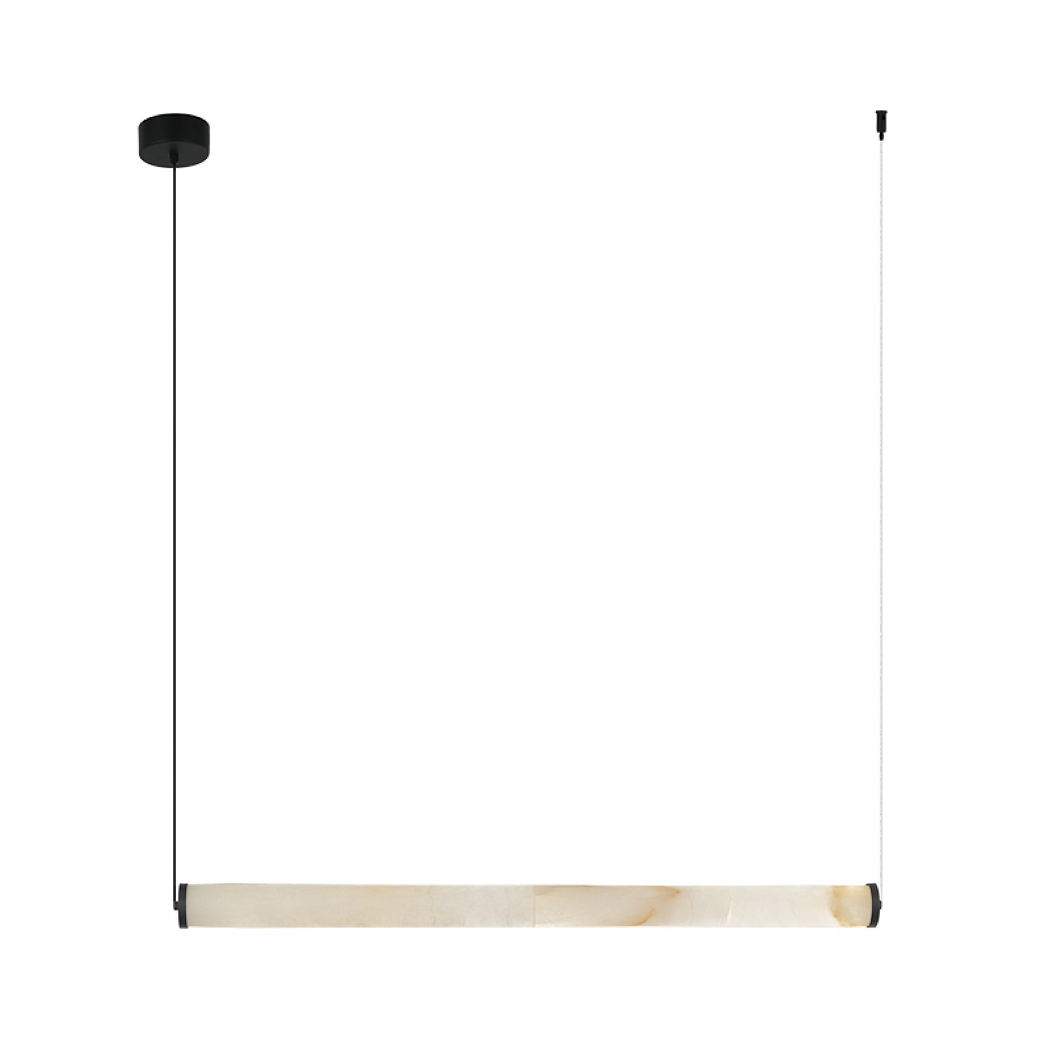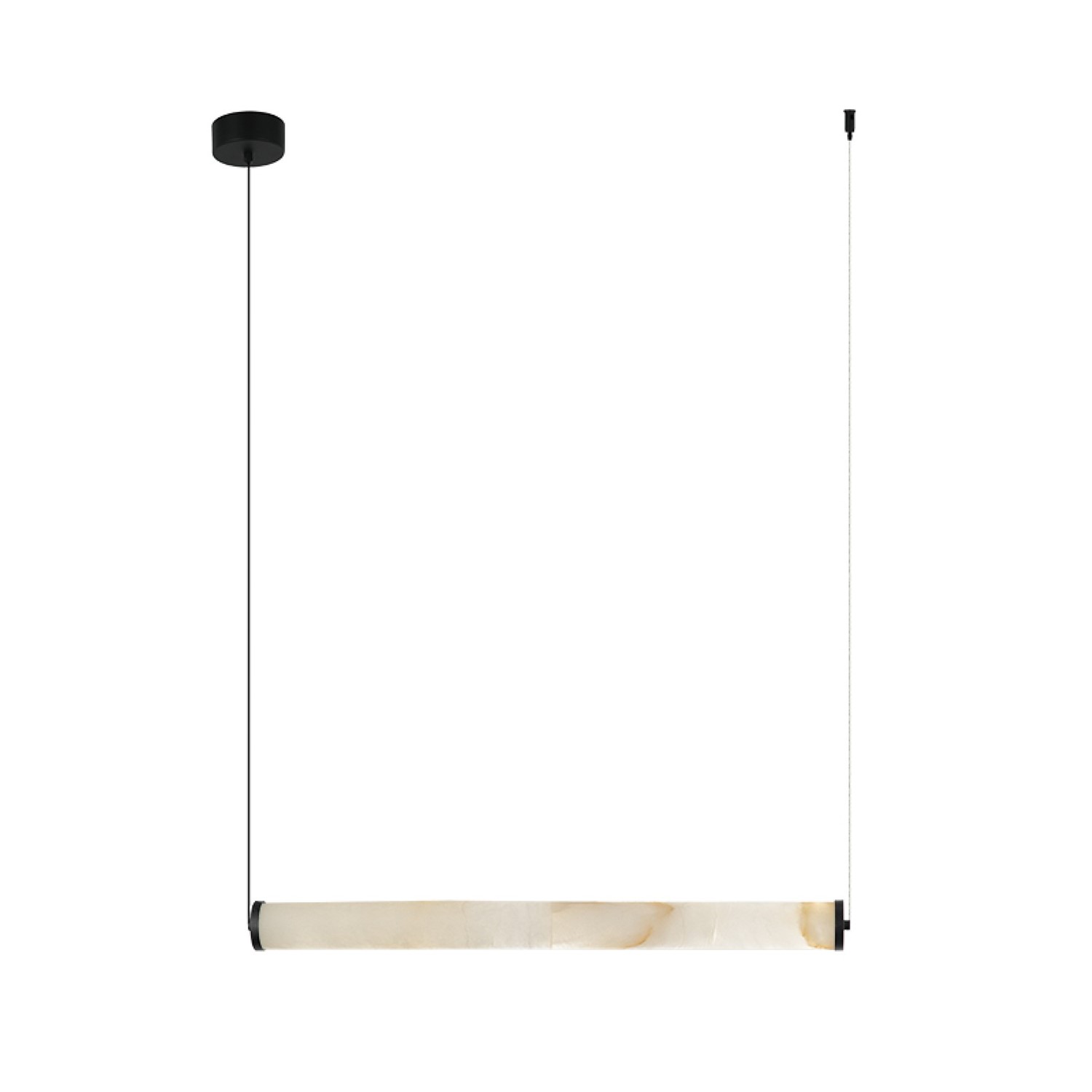 Тази дизайнерска висяща LED лампа с естествен алабастър впечатлява с модерен линеен силует и натуралната красота на материала.