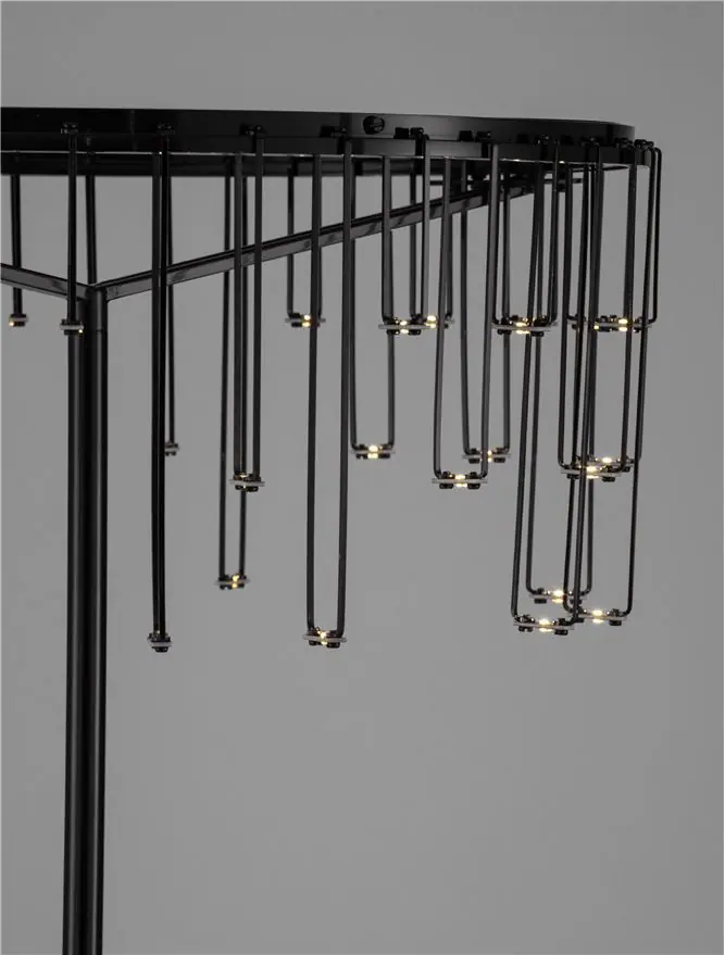 Черният хромиран метал, отворената конструкция и минималистичният силует придават индустриална естетика, докато изчистените линии и димируемата светлина го правят подходящ за съвременни и лофт интериори.