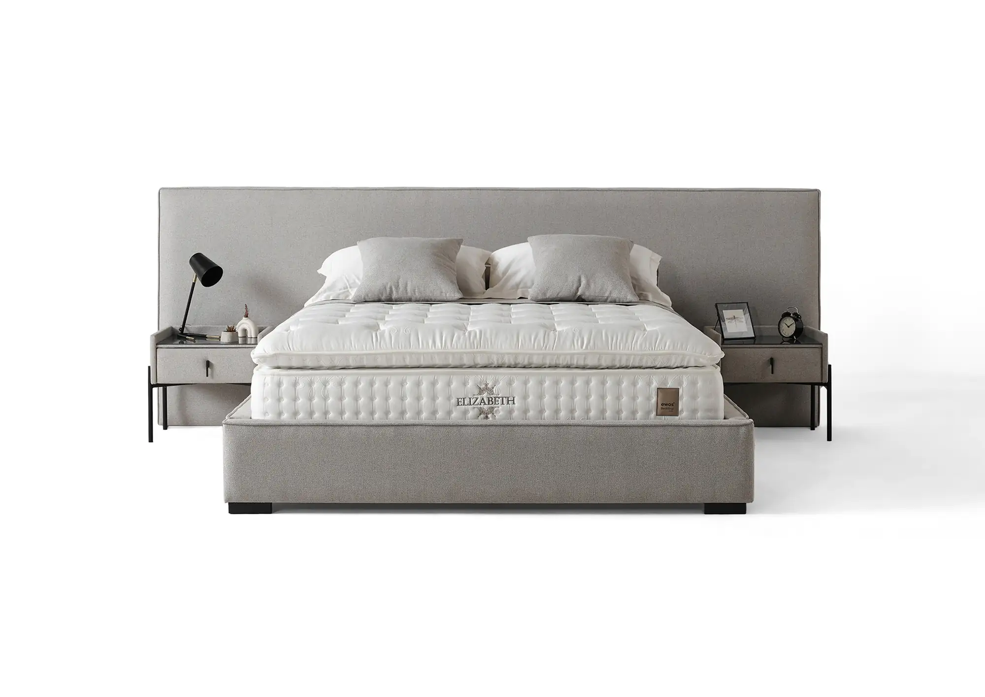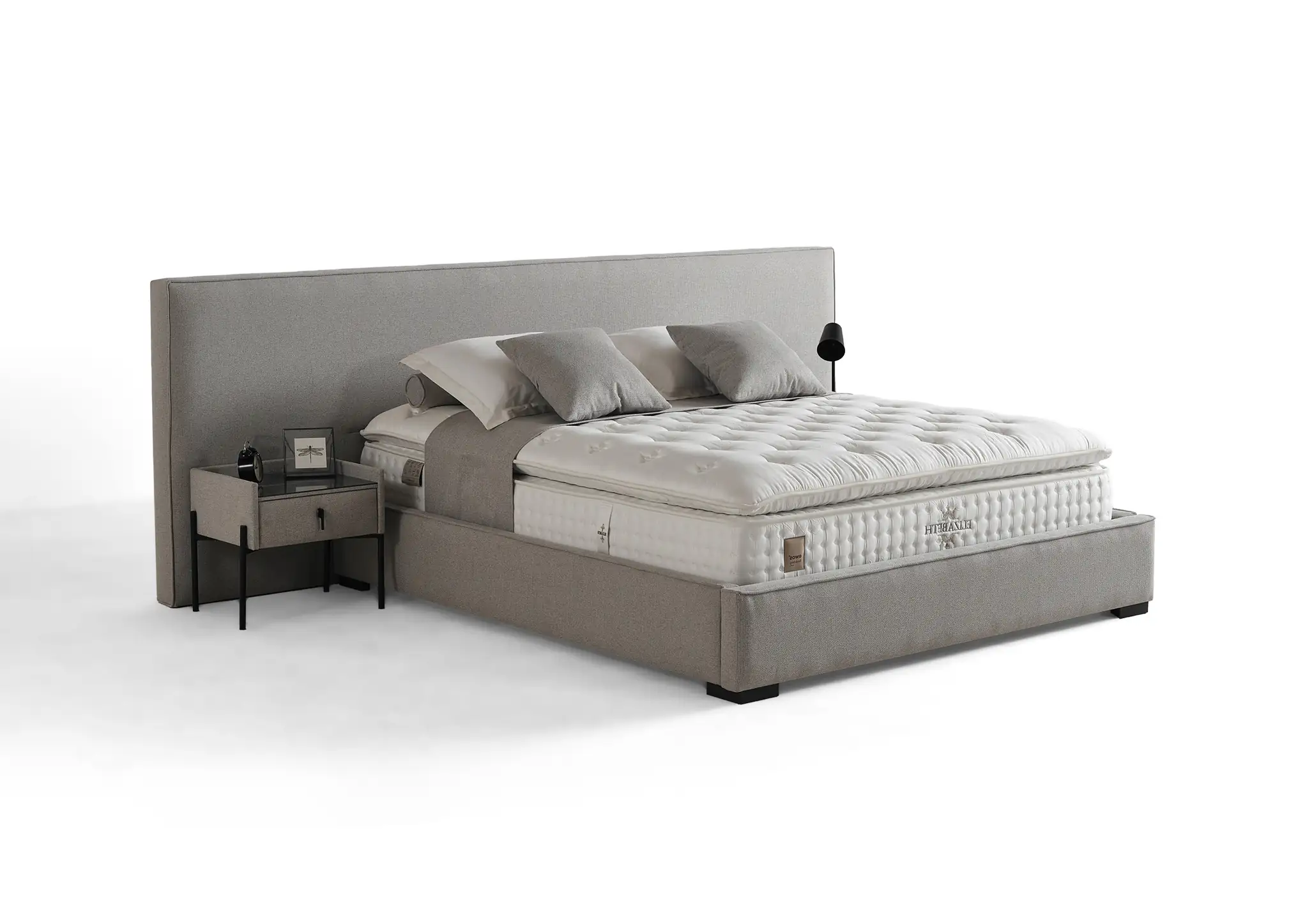 Моделът разполага с широка табла с височина 105 см, тапицирана в светлосива текстилна дамаска с фина текстура. Основата следва същата линия и оформя устойчива рамка около матрака, осигуряваща стабилна опора.