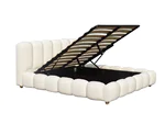 Тапицерията е изпълнена от букле текстил с характерна релефна структура и меко усещане при допир. Обемните, вертикално оформени панели по таблата и рамката създават ясно изразен силует и придават завършен вид на леглото. Светлият тон допринася за по-балансирана визия.