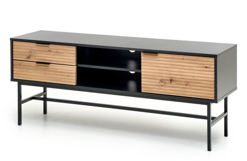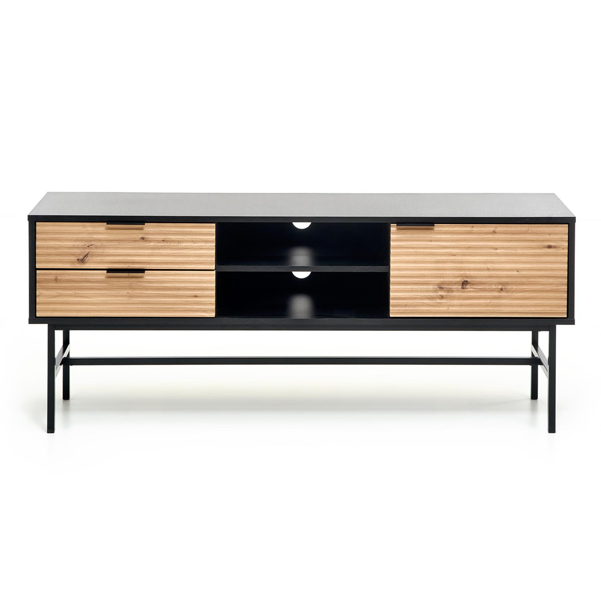 Двуцветен ТВ шкаф с две чекмеджета, открити рафтове и вратичка в цвят занаятчийски дъб и черно върху метална основа, модулна система Мурано.