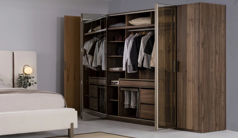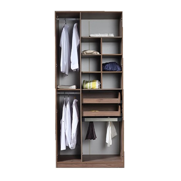 Оборудван е с девет рафта с различни размери, два от които се издърпат и предоставят възможност за съхранение на часовници и бижута, два лоста за закачалки, закачалка за панталони и вътрешно LED осветление.