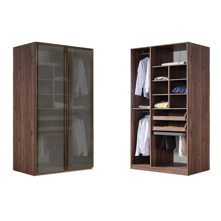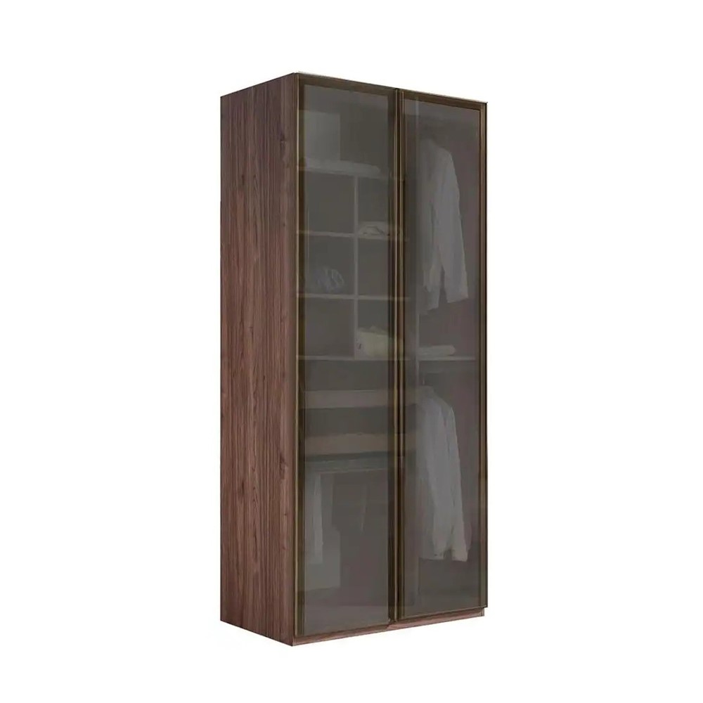 Двукрилен гардероб в цвят орех, изработен от МДФ, огледални врати от закалено опушено стъкло и метална рамка, серия Бриел.