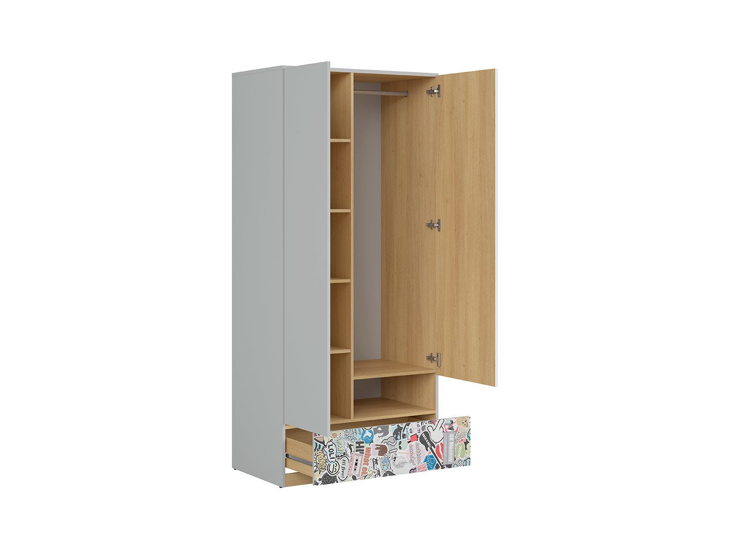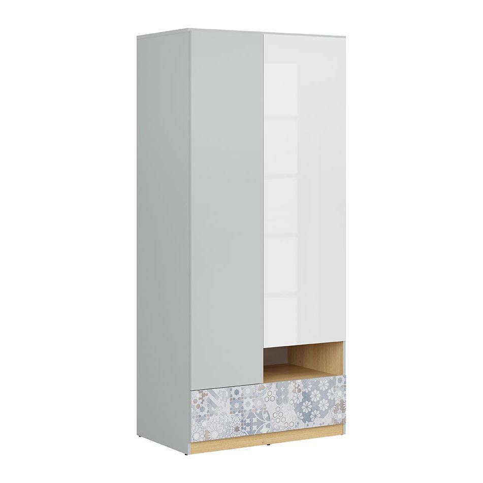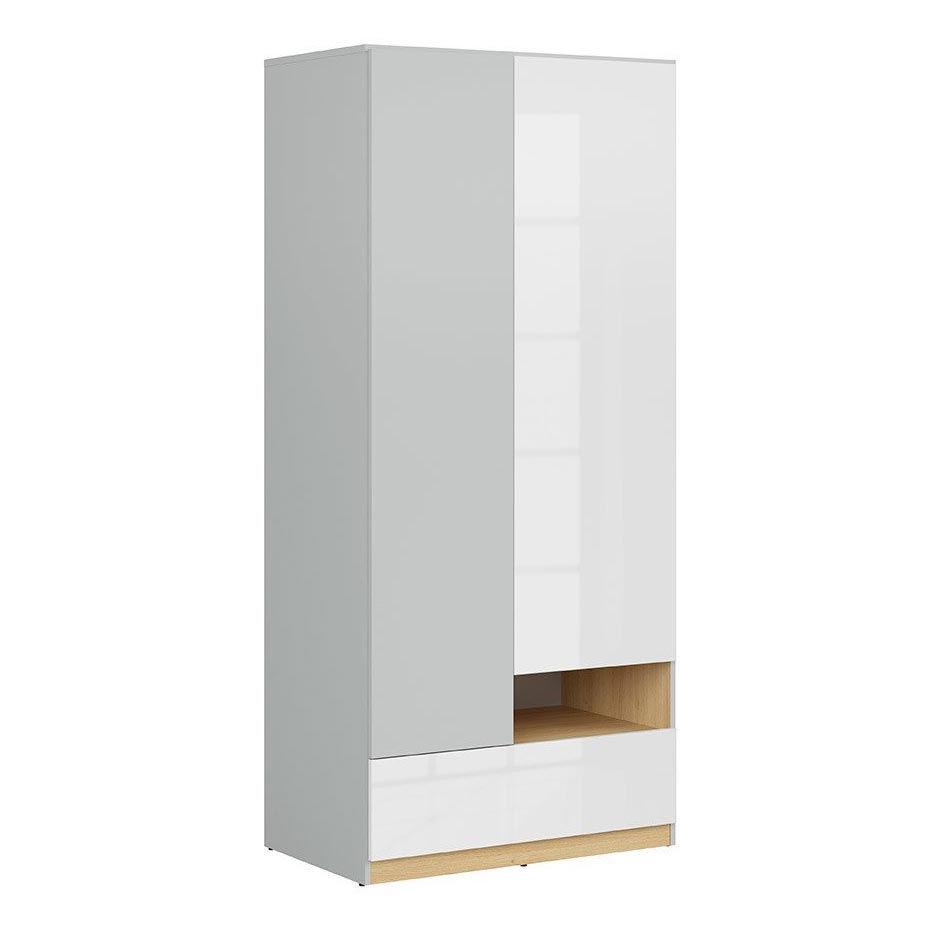 Двукрилен гардероб с открит рафт и чекмедже, решен в цвят полски дъб, светлосиво и бял гланц, модулна система Нанду.