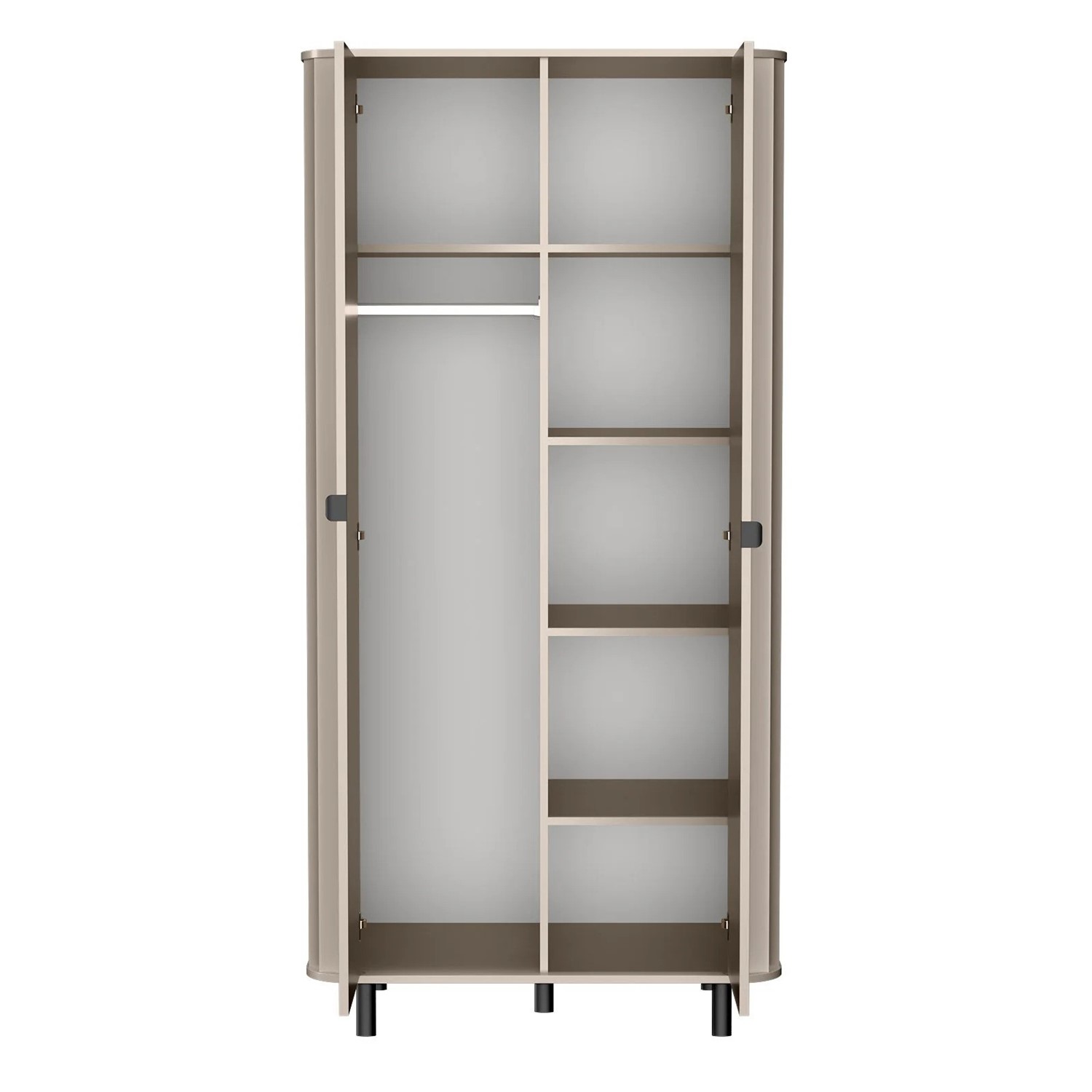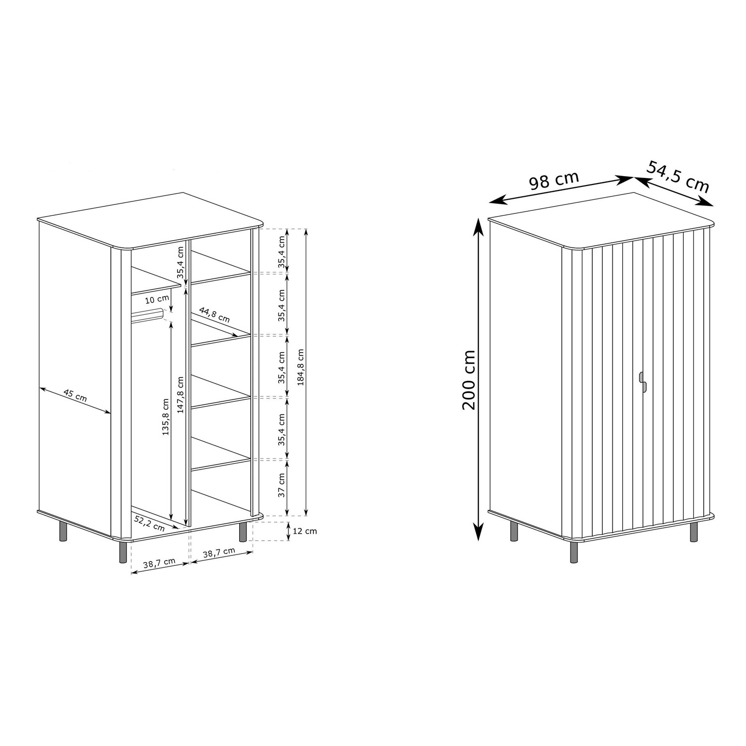Функционалният двукрилен гардероб от серия Novado впечатлява със своята практичност и отлично вътрешно разпределение – в дясната част има четири просторни рафта, идеални за подредба на пуловери, спално бельо или кутии, а в лявата част – допълнителен рафт и лост за закачане на дрехи.