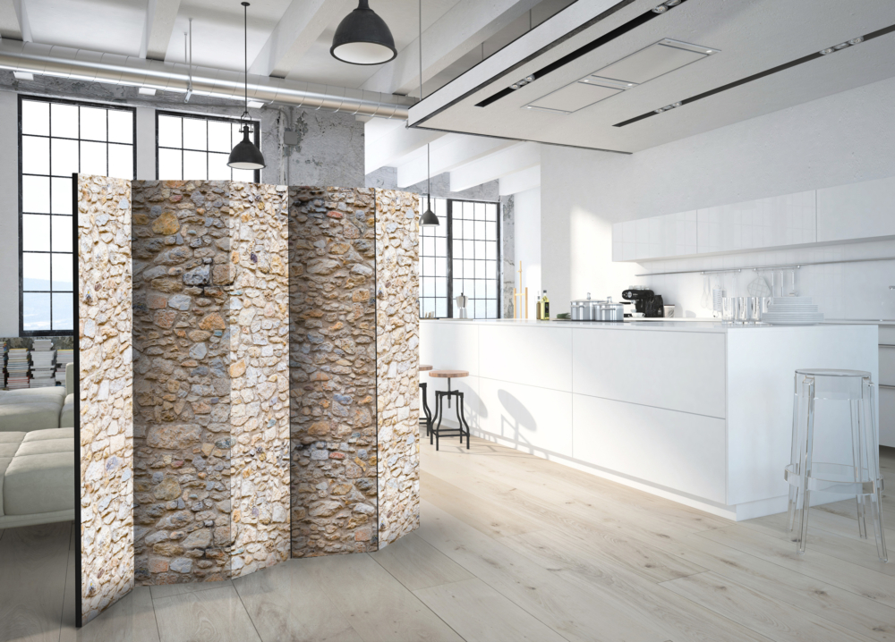 Характеристики на паравани за стая от GRANDecor Този двулицев декоративен параван като стена от релефни камъни, е оригинално допълнение към интериор, решен в индустриален или скандинавски стил. Изработен е от дървена рамка с двустранен печат върху флизалиново платно. Благодарение на оригиналния мотив с качество на печата Full HD, този параван ще придаде неповторим чар на всяко помещение!