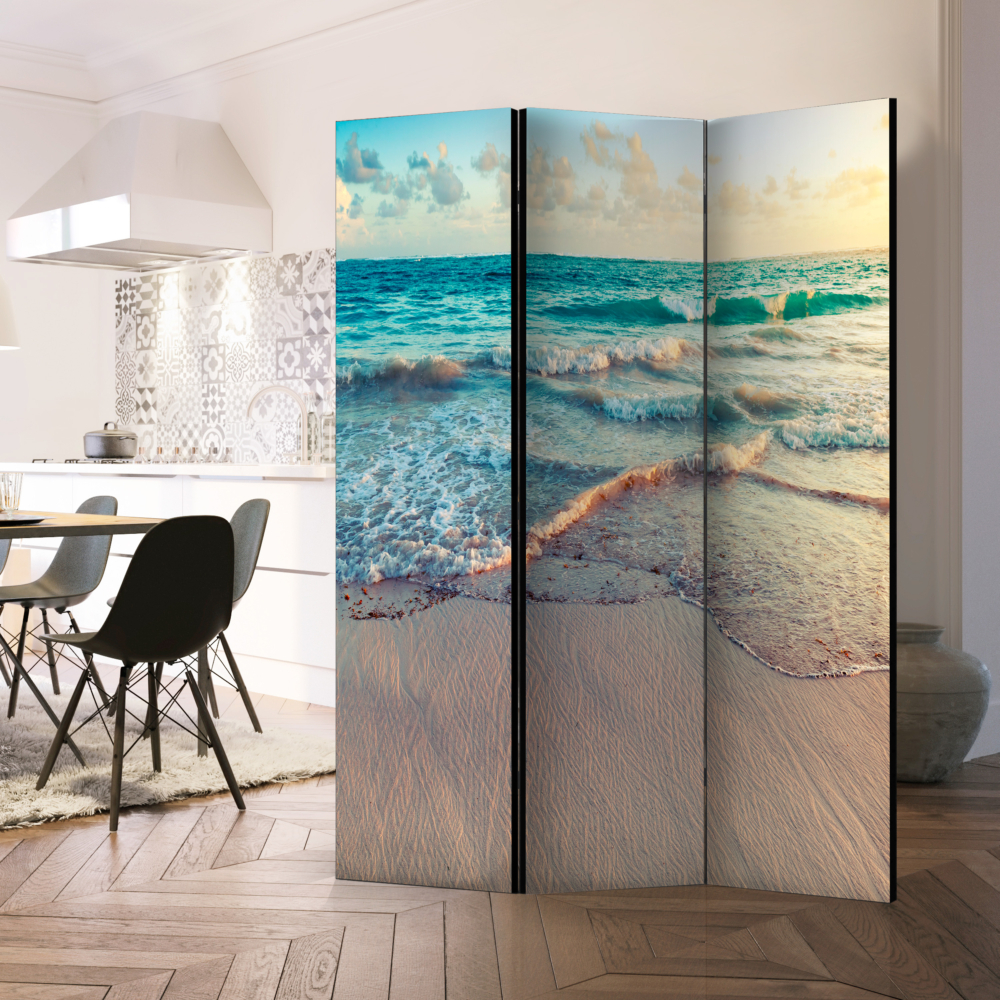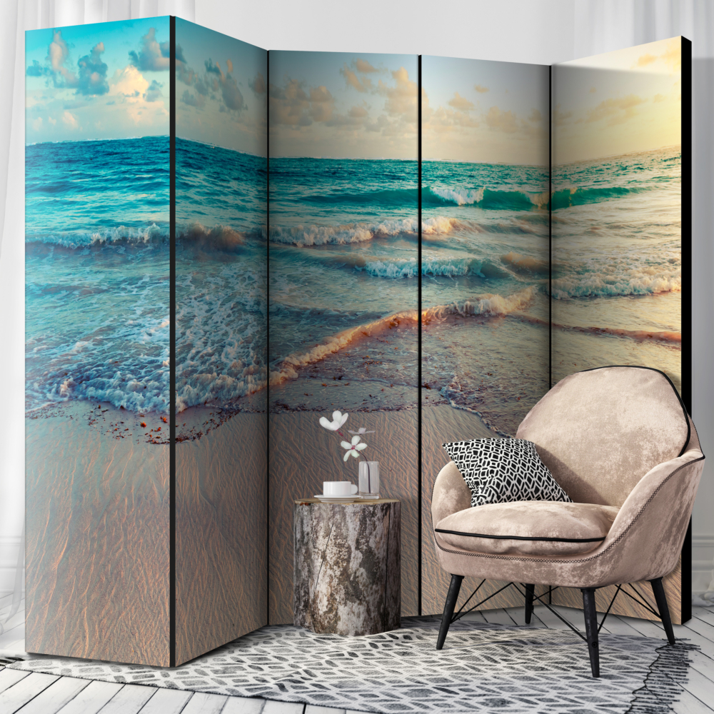 Срокът за доставка на този двулицев интериорен параван с изображение на морски изгрев над плаж е 14 – 21 дни.