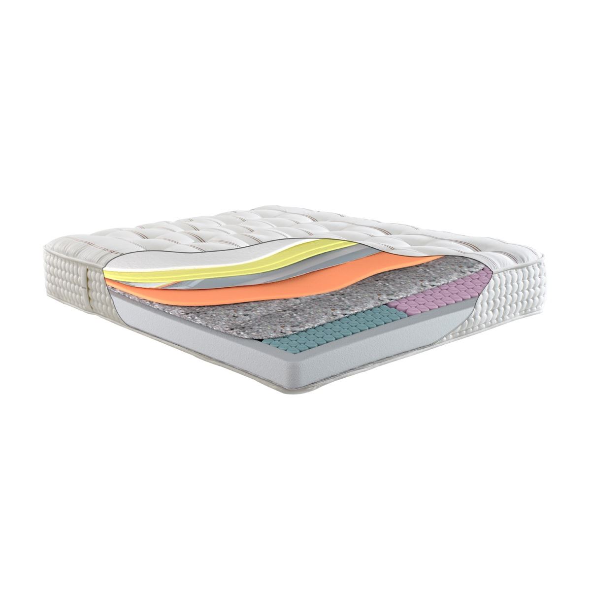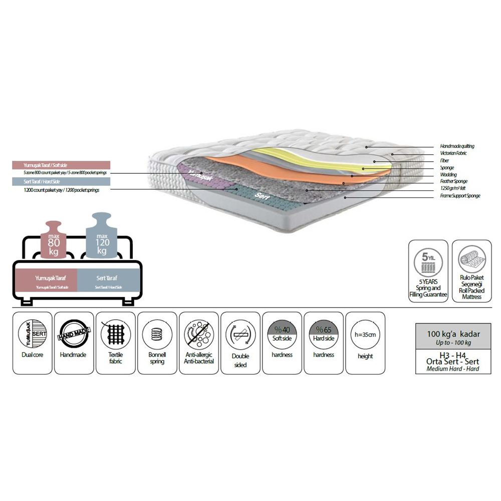 Комфортен двулицев матрак с височина 35см с ръчно изработен капитонаж на покриващата вискозна тъкан, която от своя страна е получена от букова дървесина и така допринася за поддържане баланаса на телесната температура чрез абсорбиране на влагата.