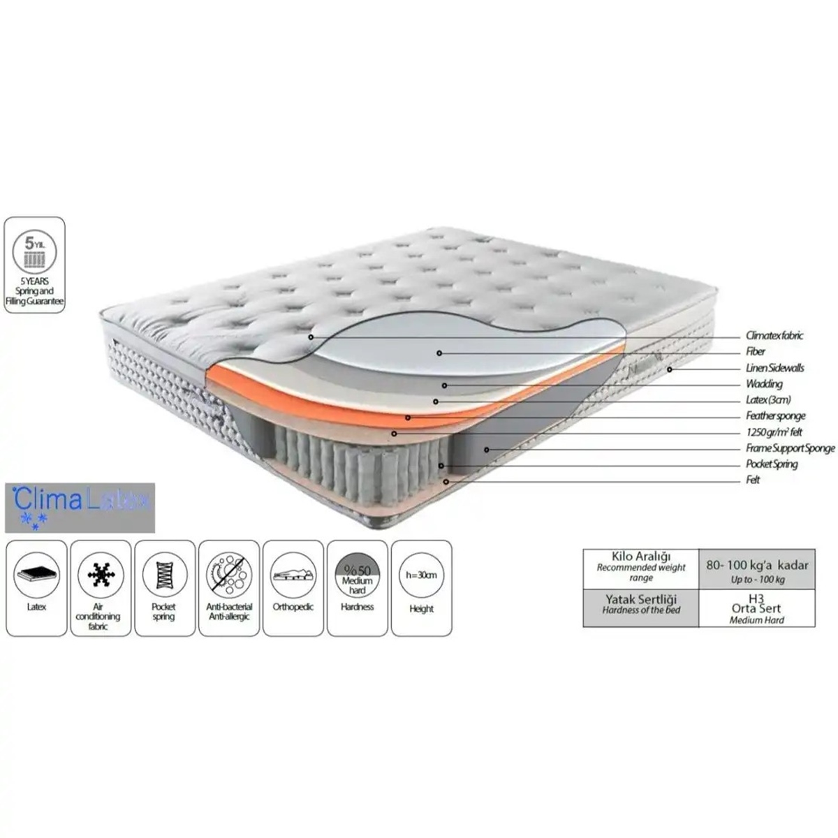 - Материал: тъкан Climatex, вата, 3 см латекс, 5-зонови покет пружини, подложка с пух