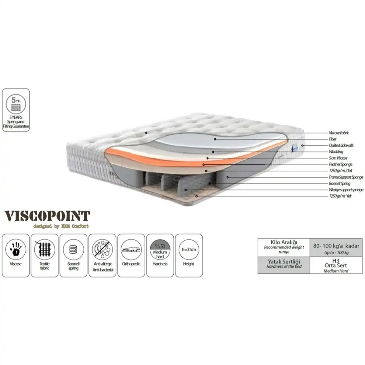 Двулицев матрак с вискоеластична подложка и пружини осигурява средно твърда ортопедична поддръжка и стабилност по време на сън.
