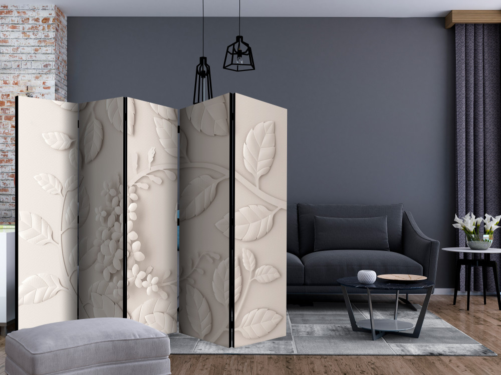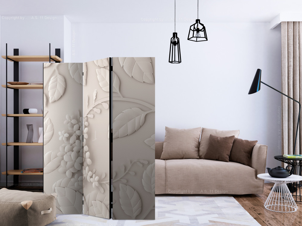 Този двулицев параван с цветя в кремав цвят и 3D ефект е оригинална декорация за интериор, решен в модерен или романтичен стил. Изработен е от дървена рамка с двустранен печат върху флизалиново платно. Благодарение на оригиналния мотив с качество на печата Full HD, този параван ще придаде неповторим чар на всяко помещение!