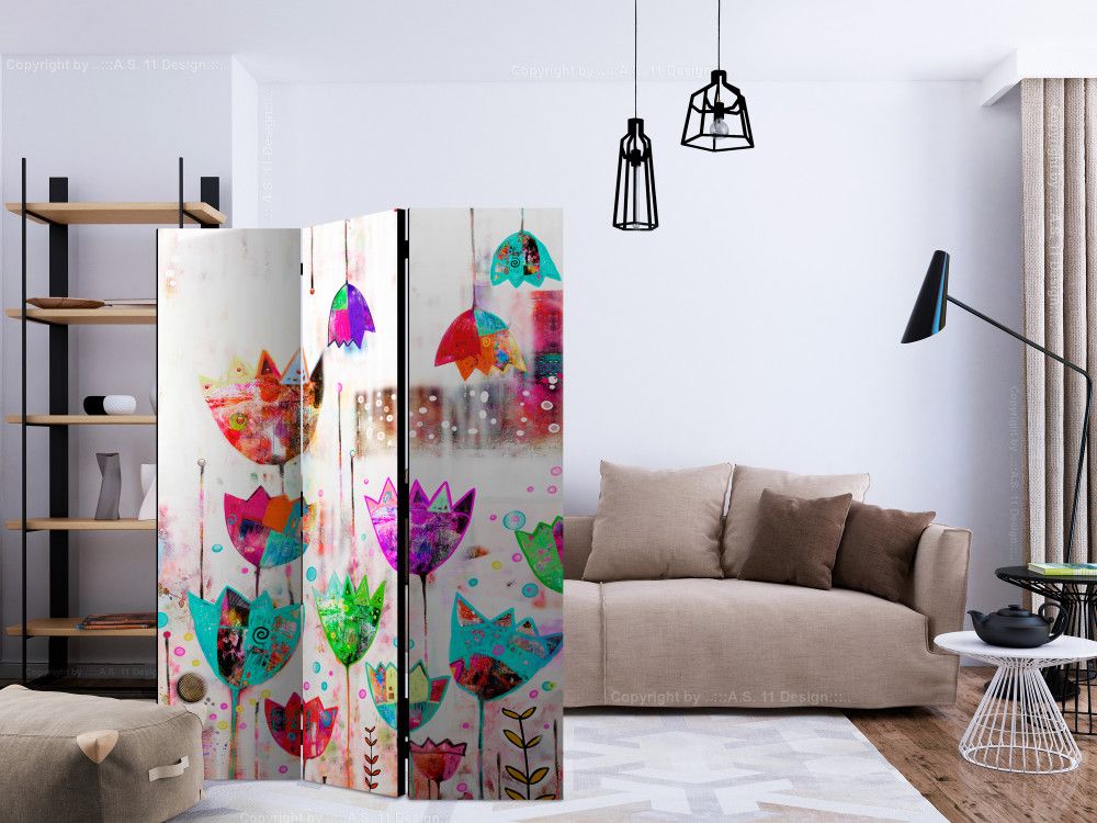 Този двулицев параван с абстрактни цветни лалета е оригинална декорация за модерен интериор. Изработен е от дървена рамка с двустранен печат върху флизалиново платно. Благодарение на оригиналния мотив с качество на печата Full HD, този параван ще придаде неповторим чар на всяко помещение!