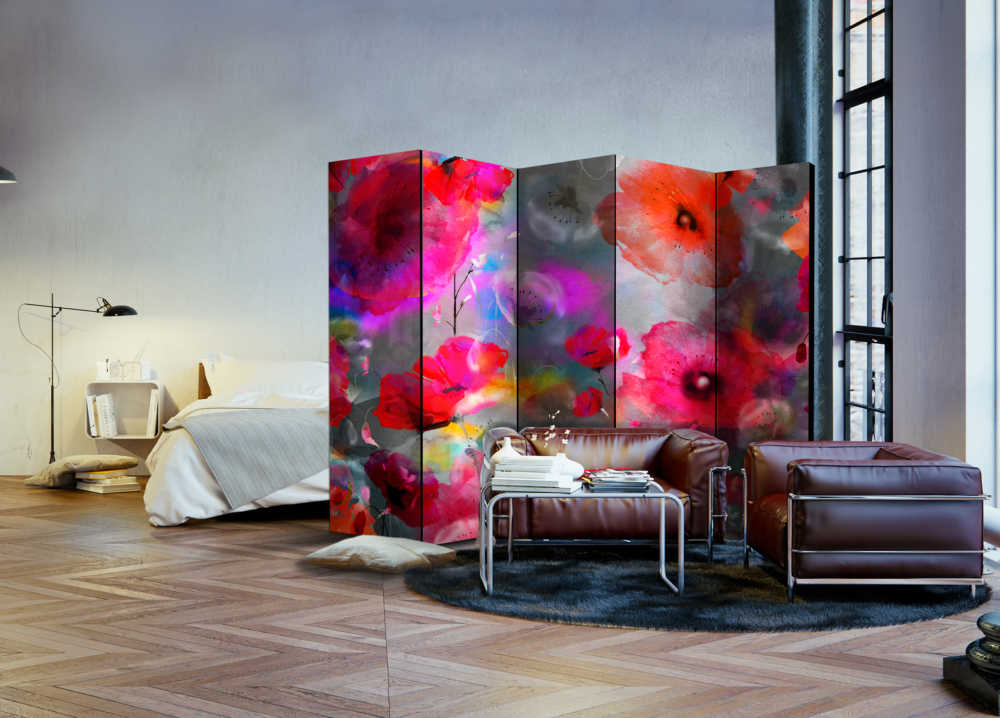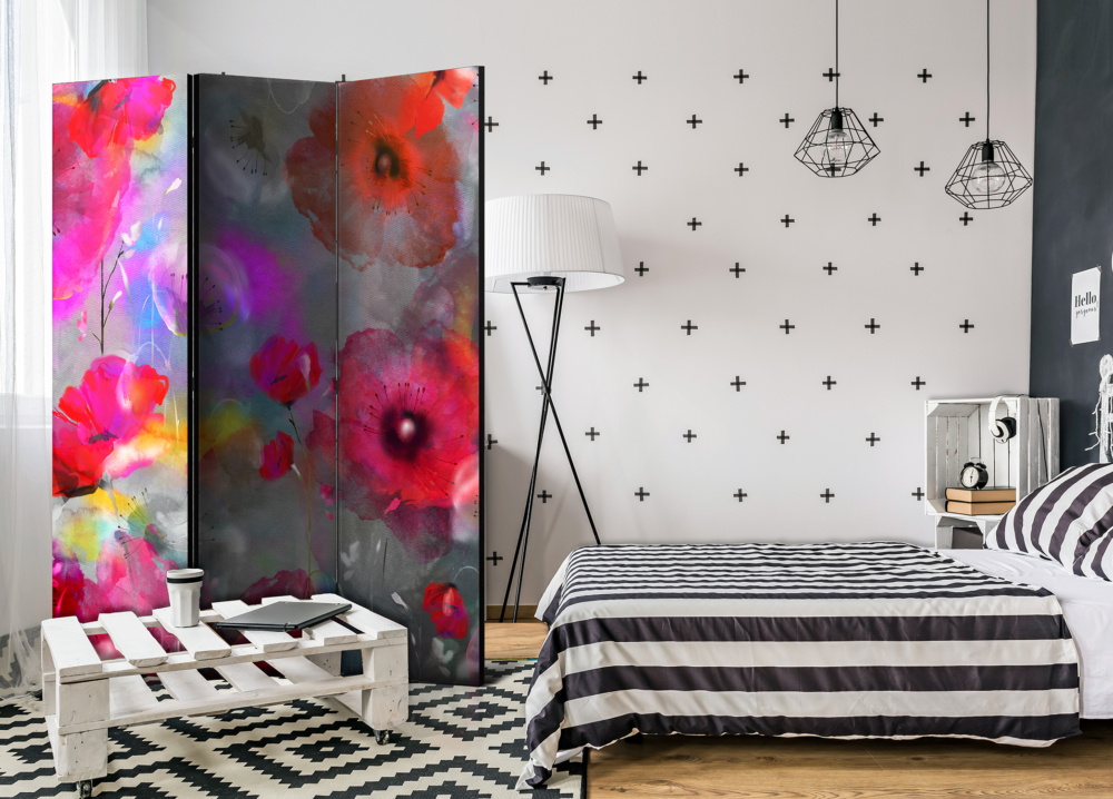 Този двулицев разделител за стая, изглеждащ като картина с рисувани макове, е оригинална декорация към дом, студио за красота или магазин, решен в модерен или романтичен стил. Изработен е от дървена рамка с двустранен печат върху флизалиново платно. Благодарение на оригиналния мотив с качество на печата Full HD, този параван ще придаде неповторим чар на всяко помещение!