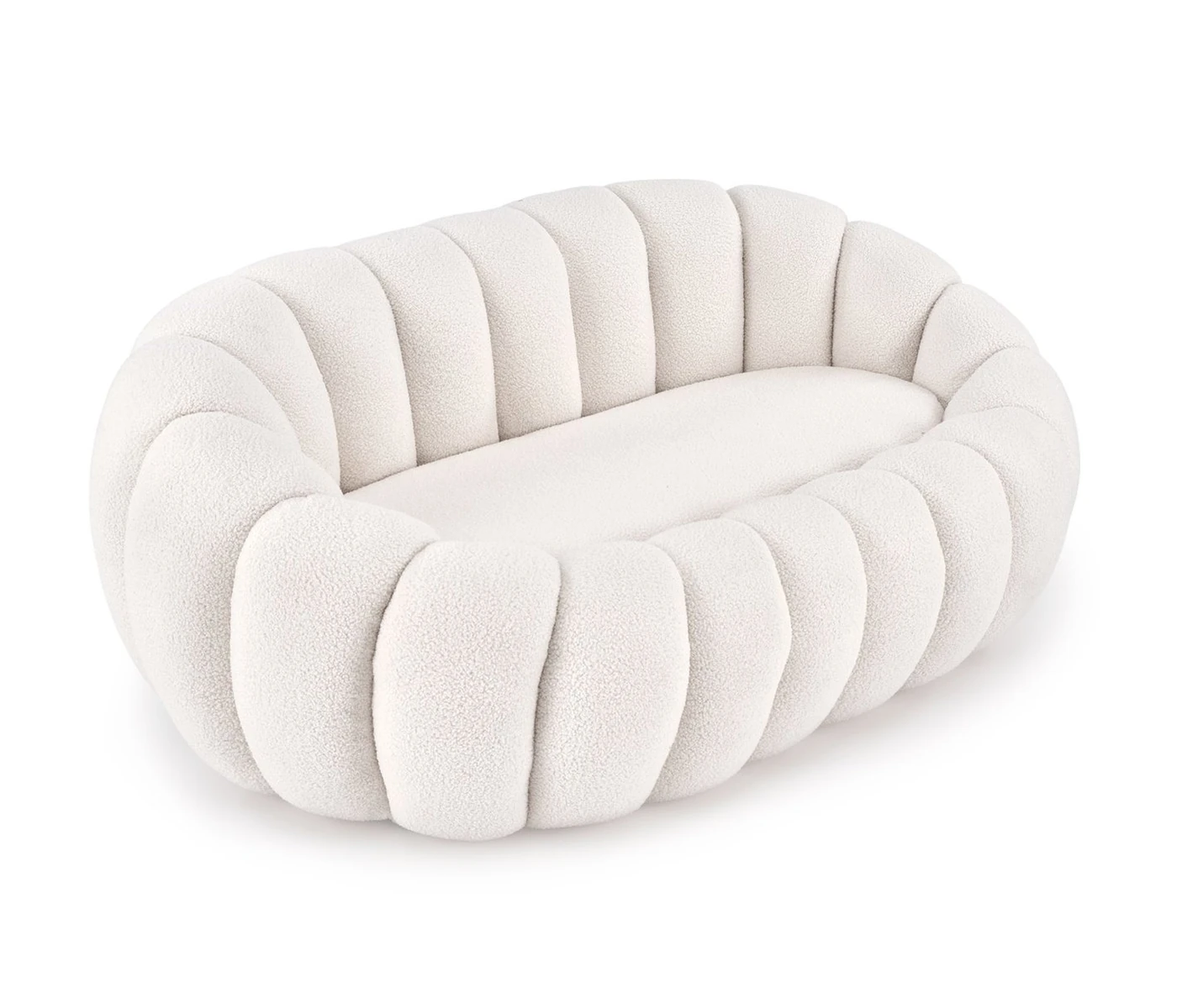 Двуместно канапе от букле Gaspar впечатлява с отличителна овална форма и ясно изразена текстура. Тапицерията е изпълнена от плат букле в кремав цвят, характеризиращ се с мека релефна структура, придаваща визуална дълбочина и комфорт при допир. Седалката е широка и добре оформена, а облегалката следва извивката на конструкцията, осигурявайки равномерна опора.