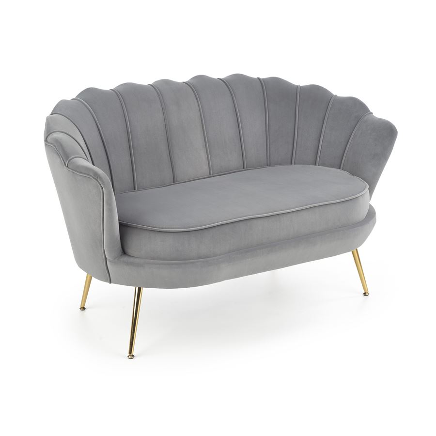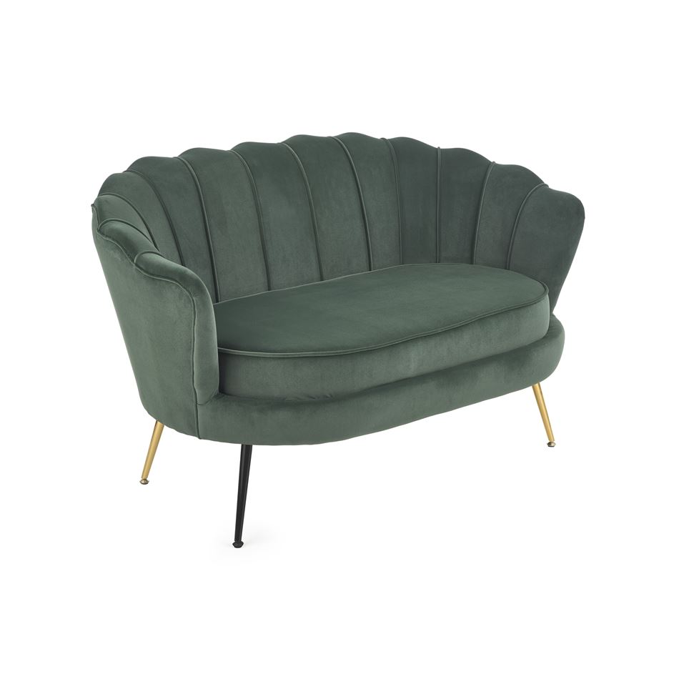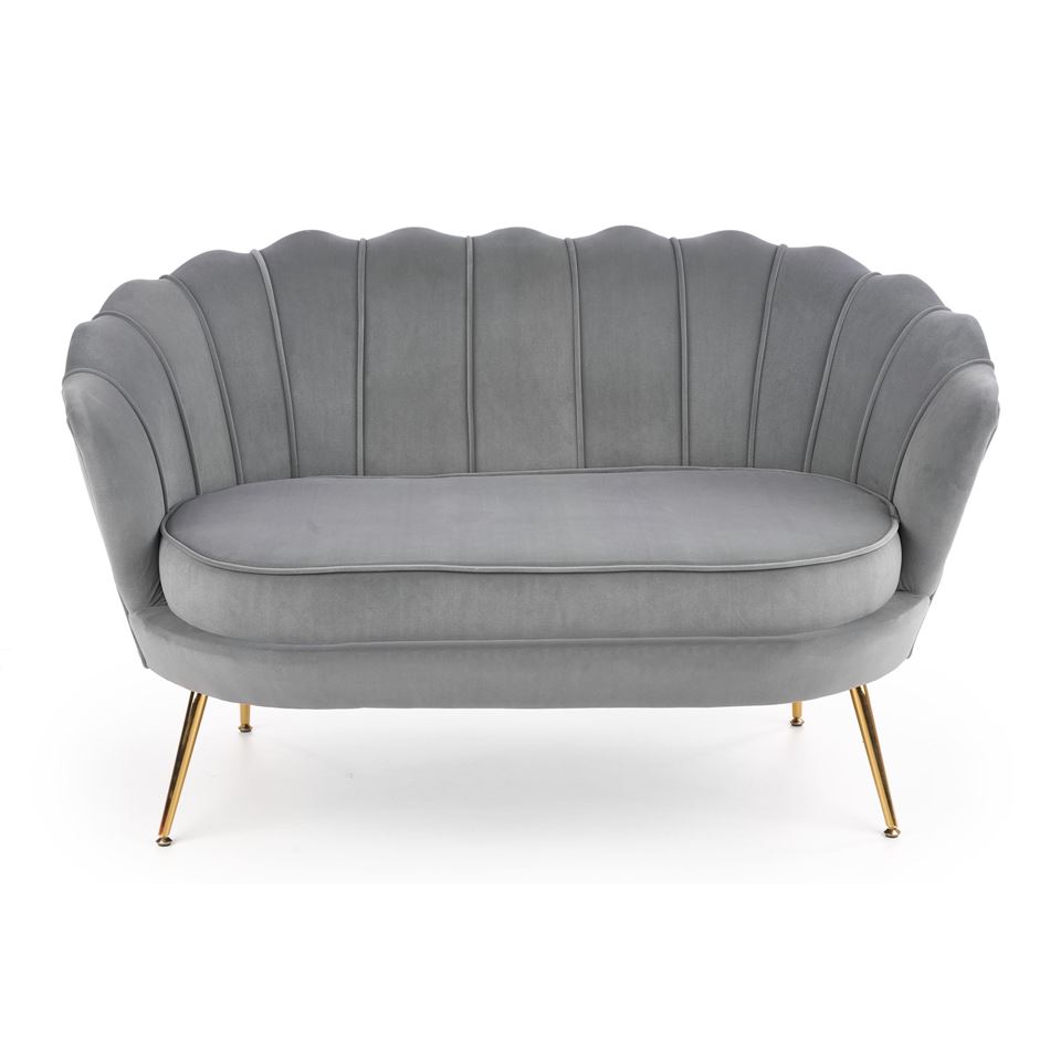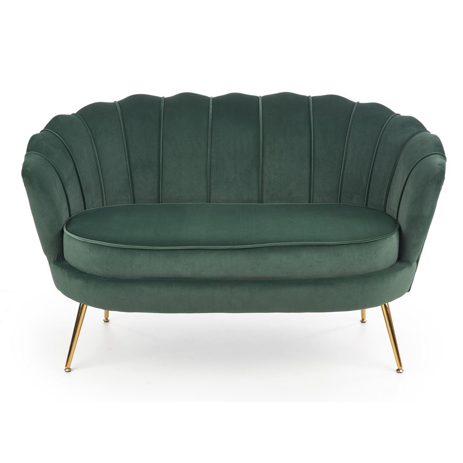 Стилно двуместно канапе, изработено с плюшена дамаска с широка облегалка и метални крачета в златист цвят.