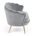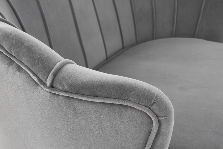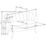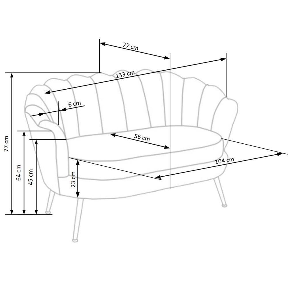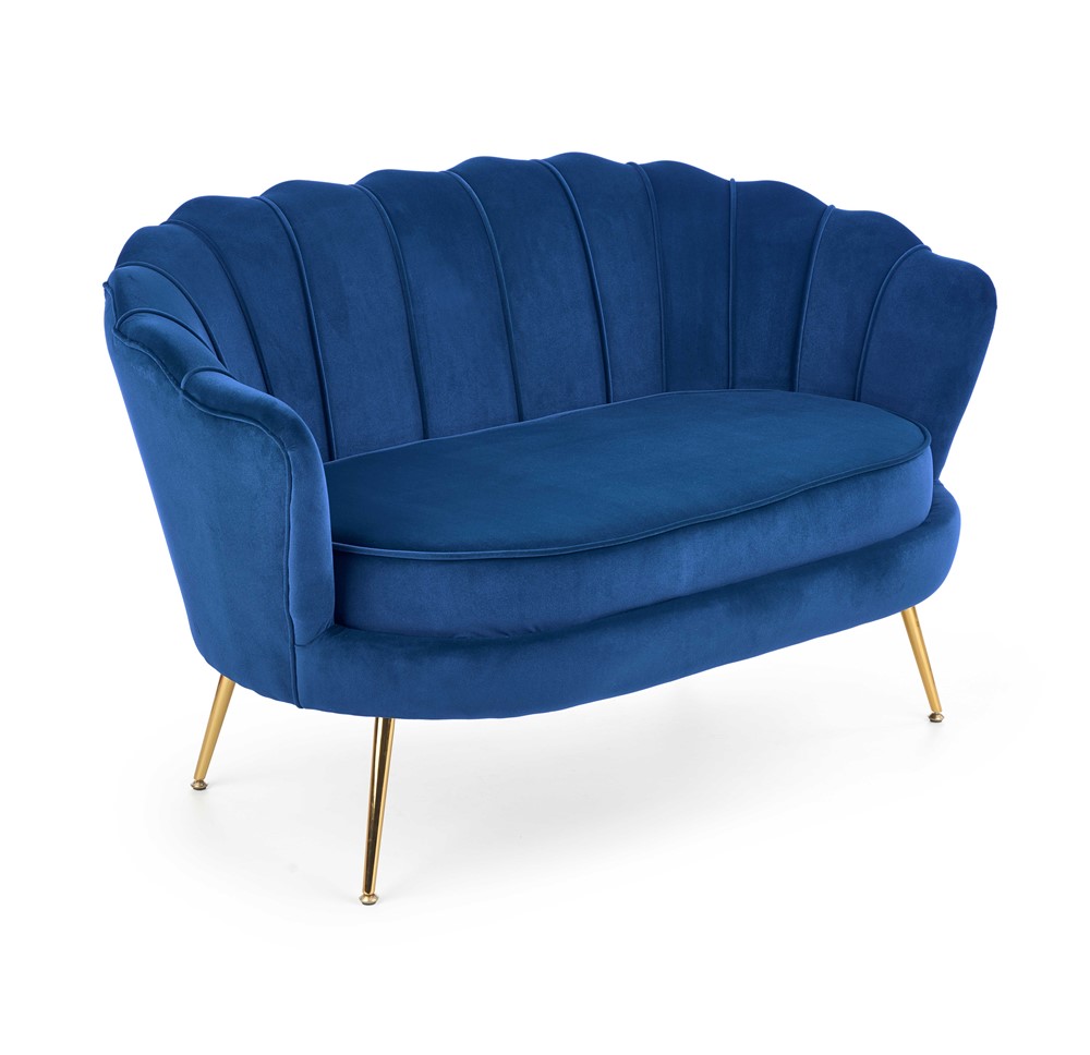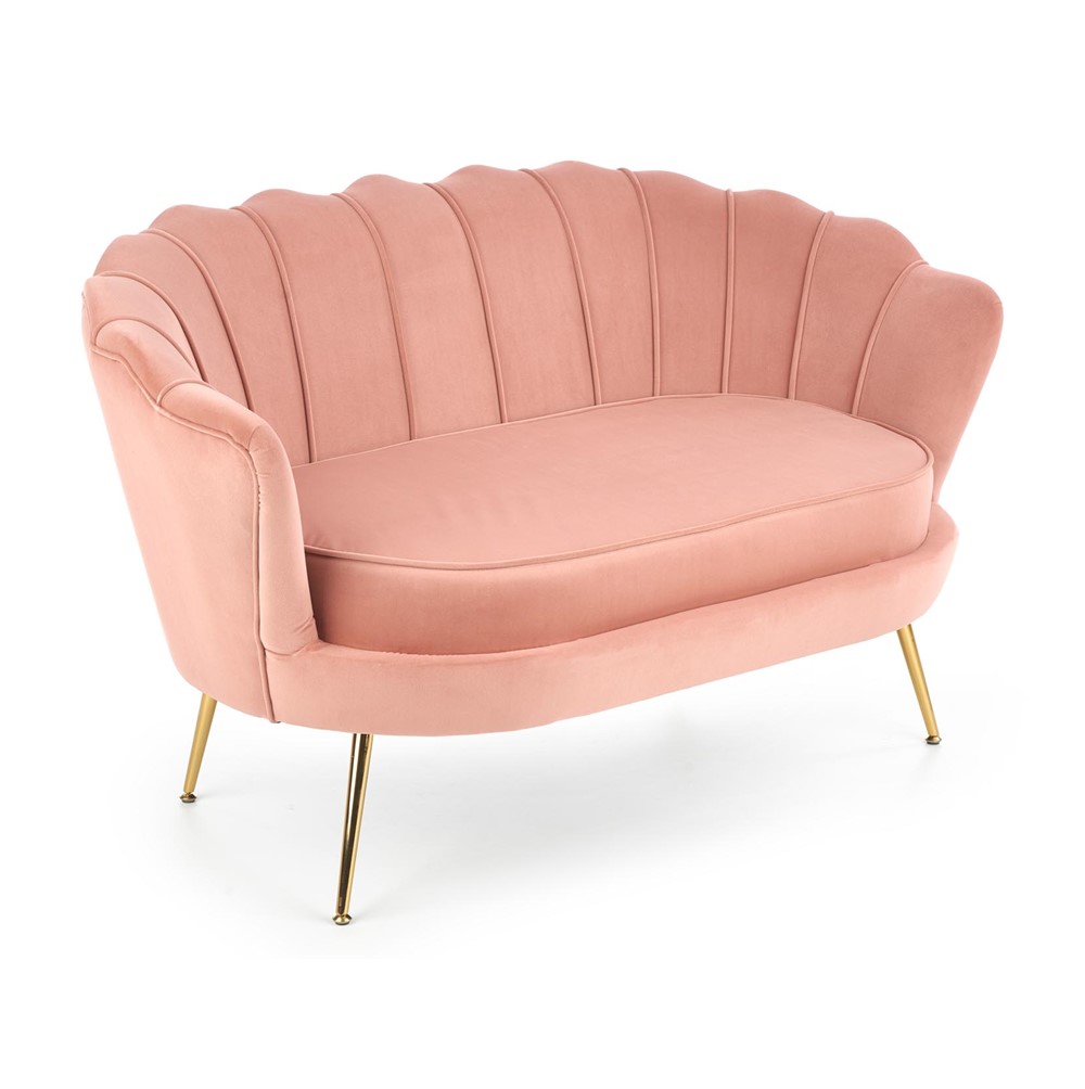 Стилно двуместно канапе, изработено с плюшена дамаска с широка облегалка и метални крачета в златист цвят.