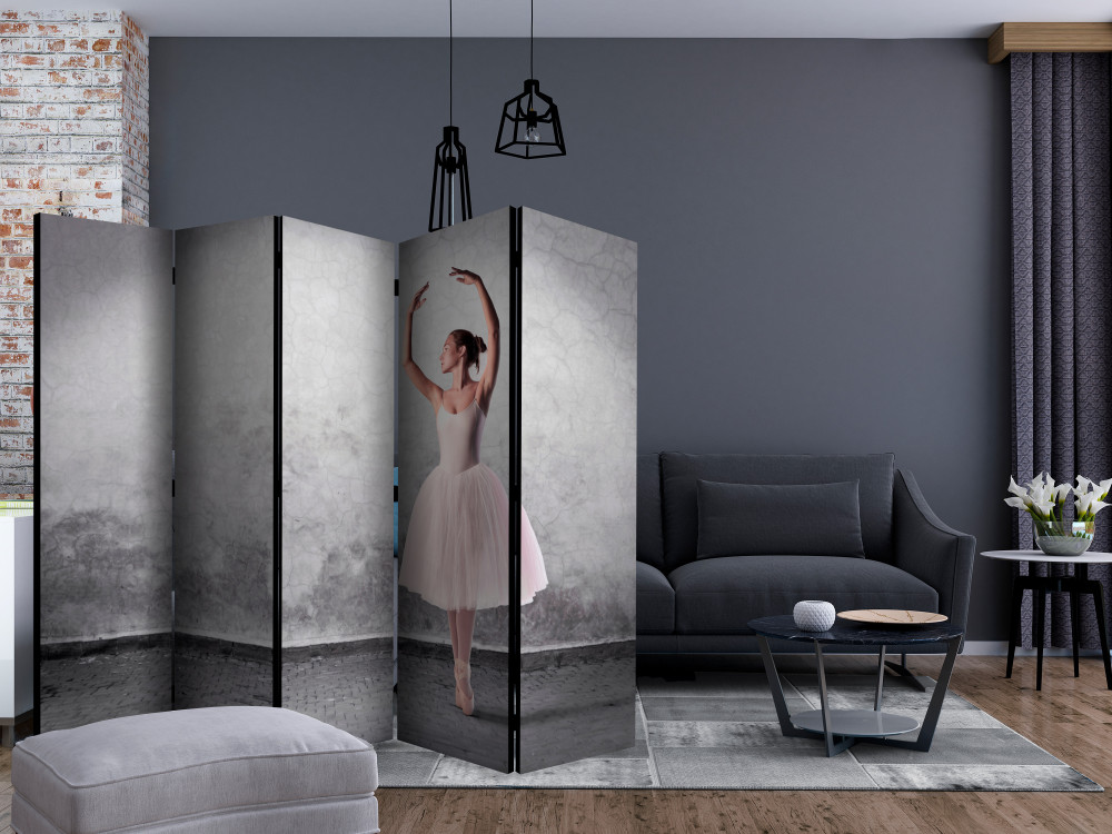 Този двустранен сгъваем параван с балерина на сив фон е оригинална декорация за дом с модерен интериор, ателие, бутик или танцова зала. Изработен е от дървена рамка с двустранен печат върху флизалиново платно. Благодарение на оригиналния мотив с качество на печата Full HD, този параван ще придаде неповторим чар на всяко помещение!