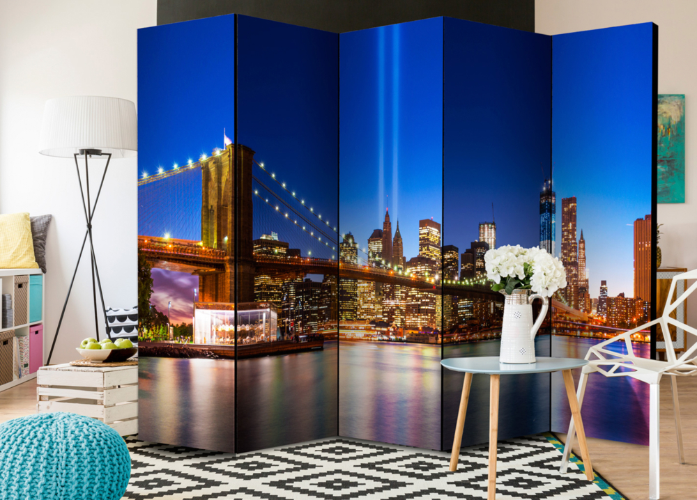 Този двустранен параван за стая с изображение на Бруклинския мост и нощен Ню Йорк, е красива декорация за всеки съвременен дом, кафене или бар. Изработен е от дървена рамка с двустранен печат върху флизалиново платно. Благодарение на оригиналния мотив с качество на печата Full HD, този параван ще придаде неповторим чар на всяко помещение!