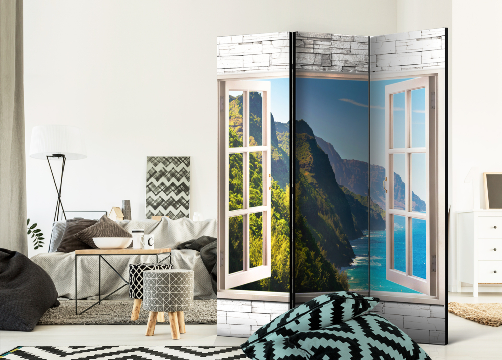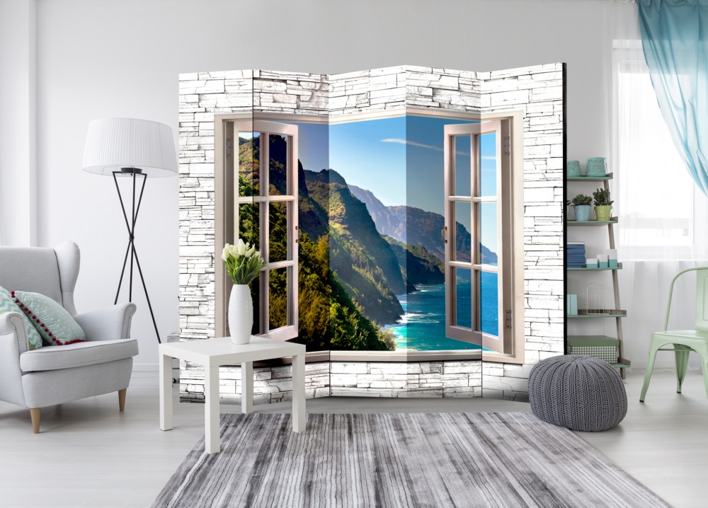 Срокът за доставка на този двустранен сгъваем параван за стая с изображение на прозорец с гледка към островни брегове е 14 – 21 дни.