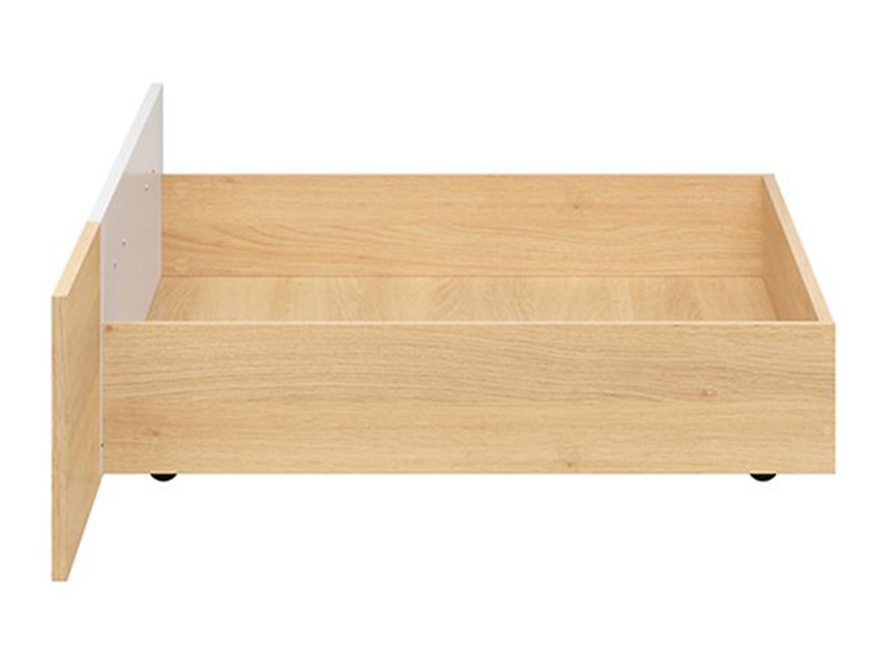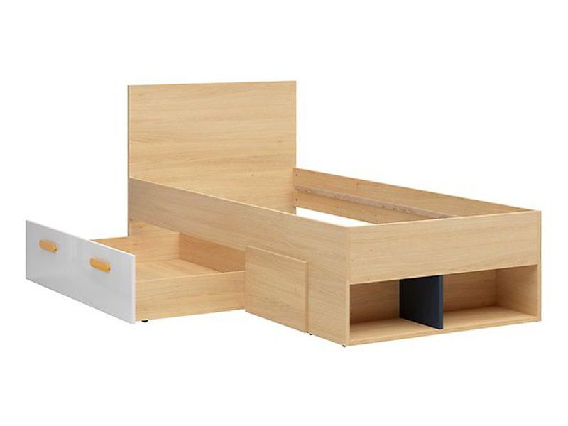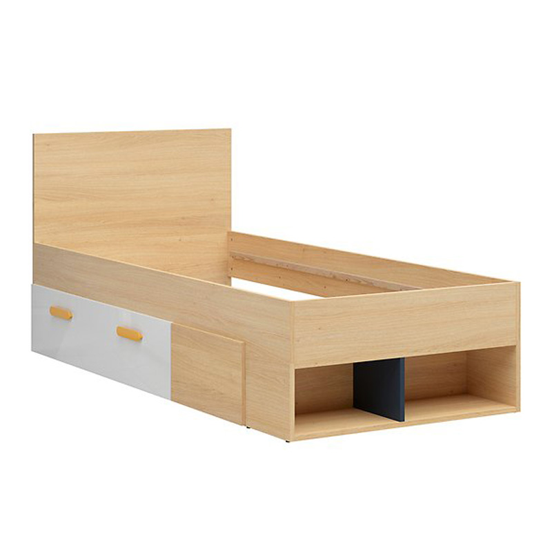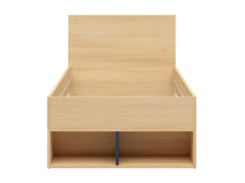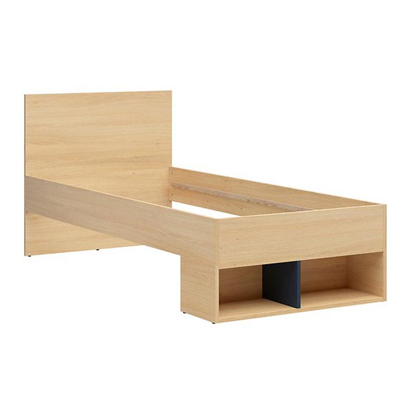 Единично легло в цвят полски дъб с място за съхранение, представено от рафтове с тъмносиня преграда в долната част, подходящо за матрак 90х200 см, модулна система Вескер.