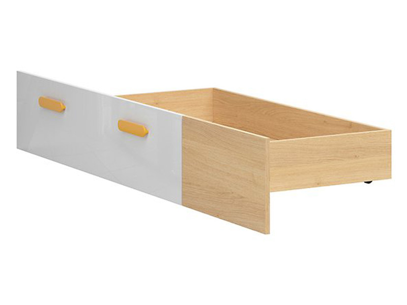 Този модел се предлага с опция за добавяне на чекмедже на колелца с бял гланц и жълти дръжки.