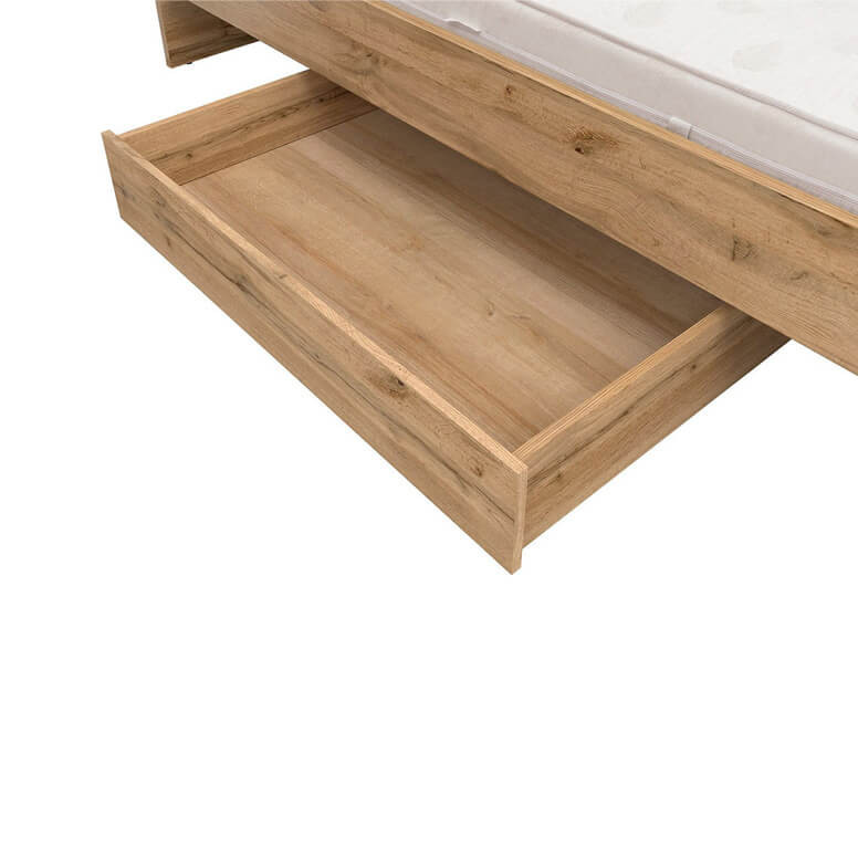 Леглото се предлага без матрак, с възможност за добавяне на чекмедже с ролкови водачи, което се предлага във вариант в дървесен цвят или с покритие от бял лак по челото.
