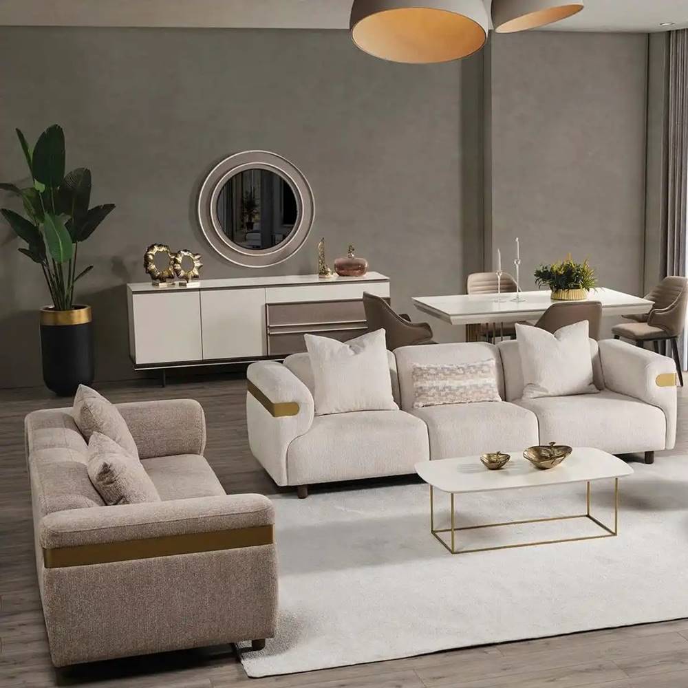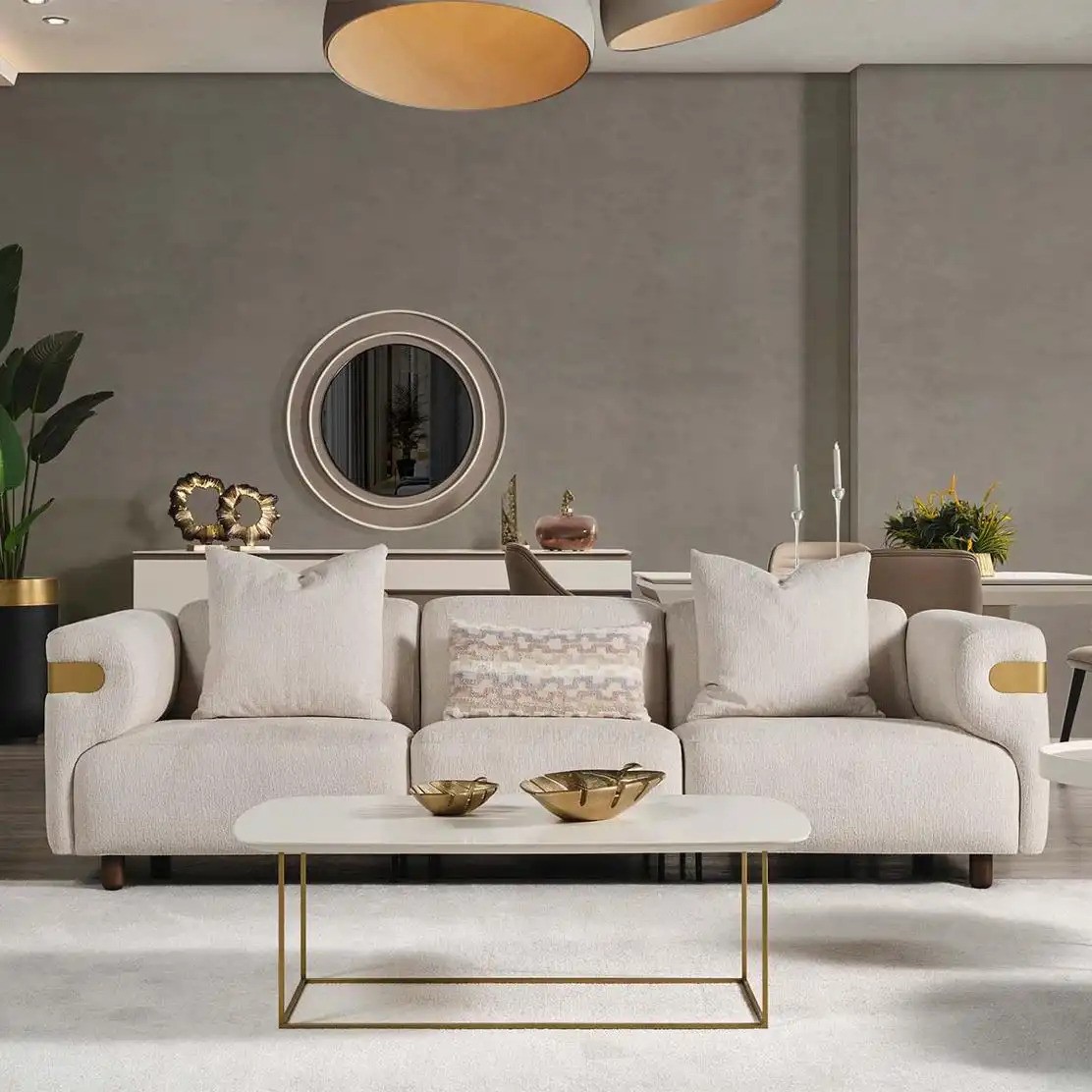 Елегантният диван в цвят крем впечатлява с меките си извивки и златистите акценти по подлакътниците, които придават усещане за лукс и индивидуалност.