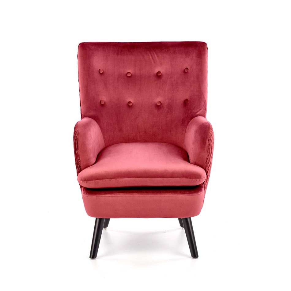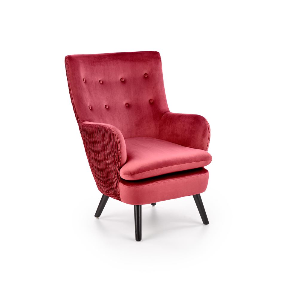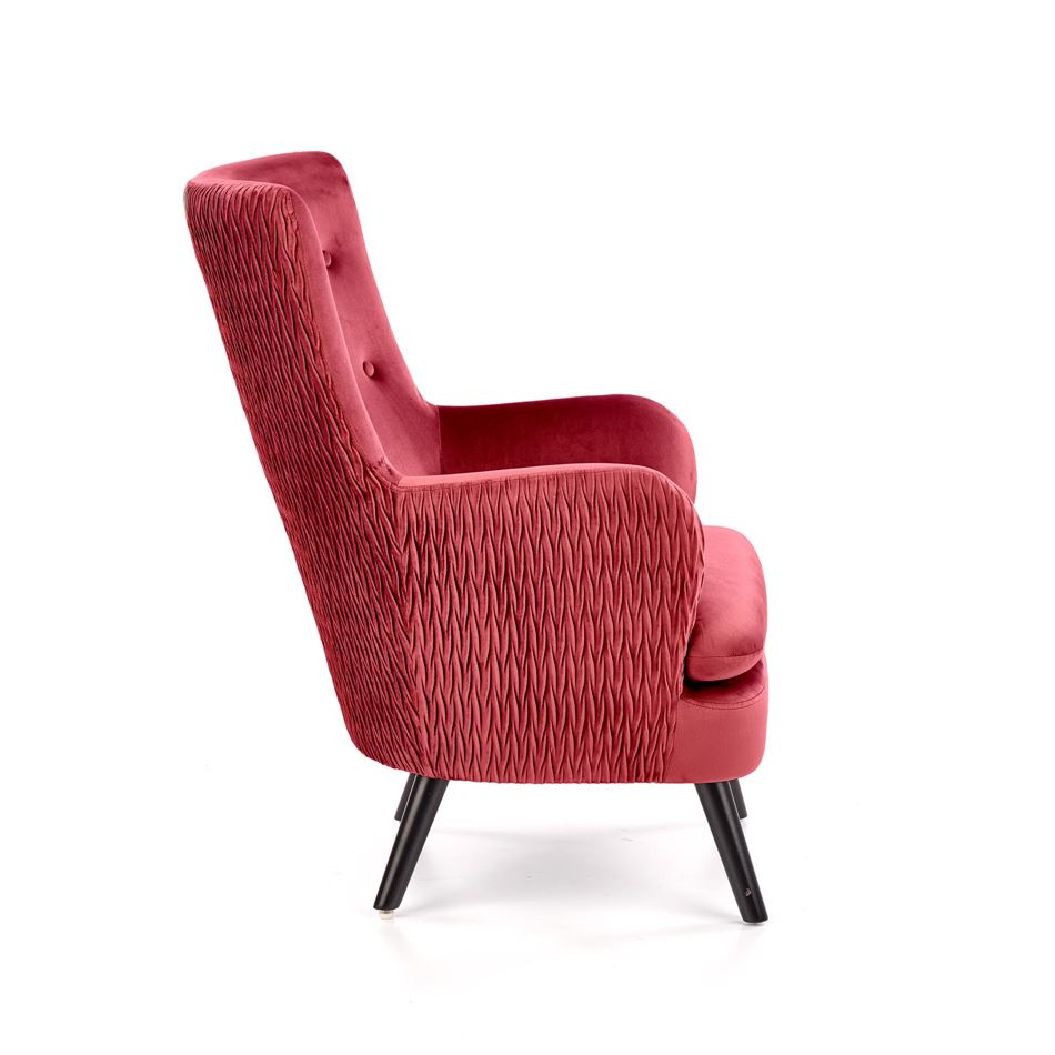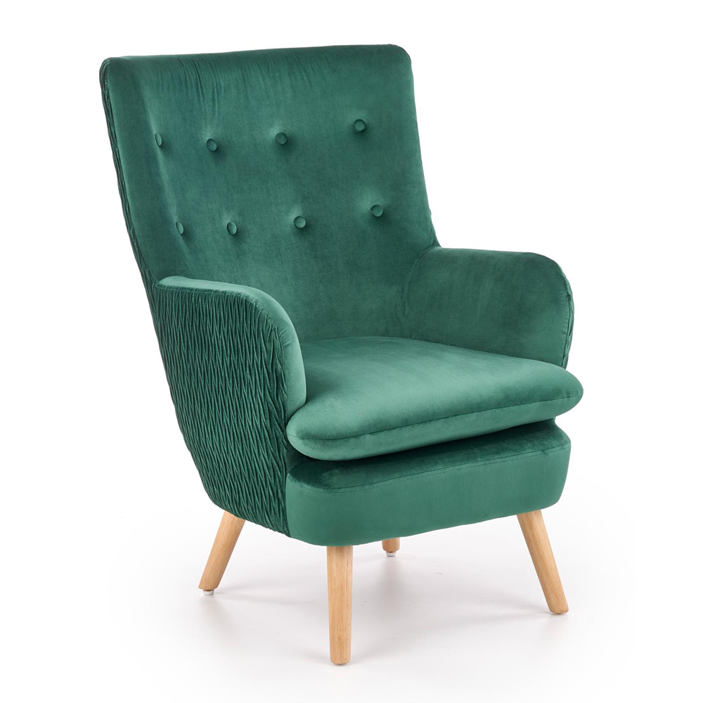 Елегантен фотьойл с дамаска от кадифе, широка облегалка, релефни страници и дървени крачета Primo, който се предлага с тапицерия в четири различни цвята – зелен, син, сив или бордо.