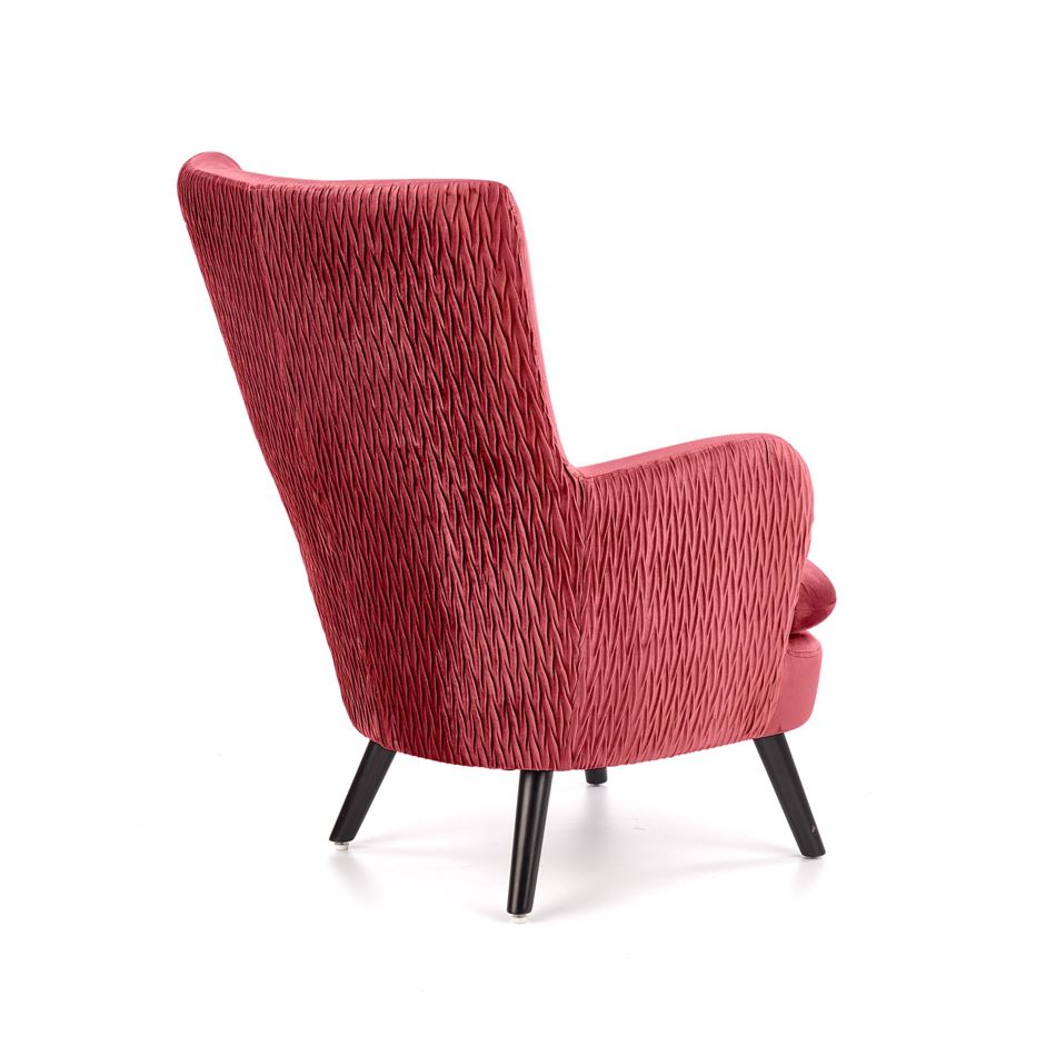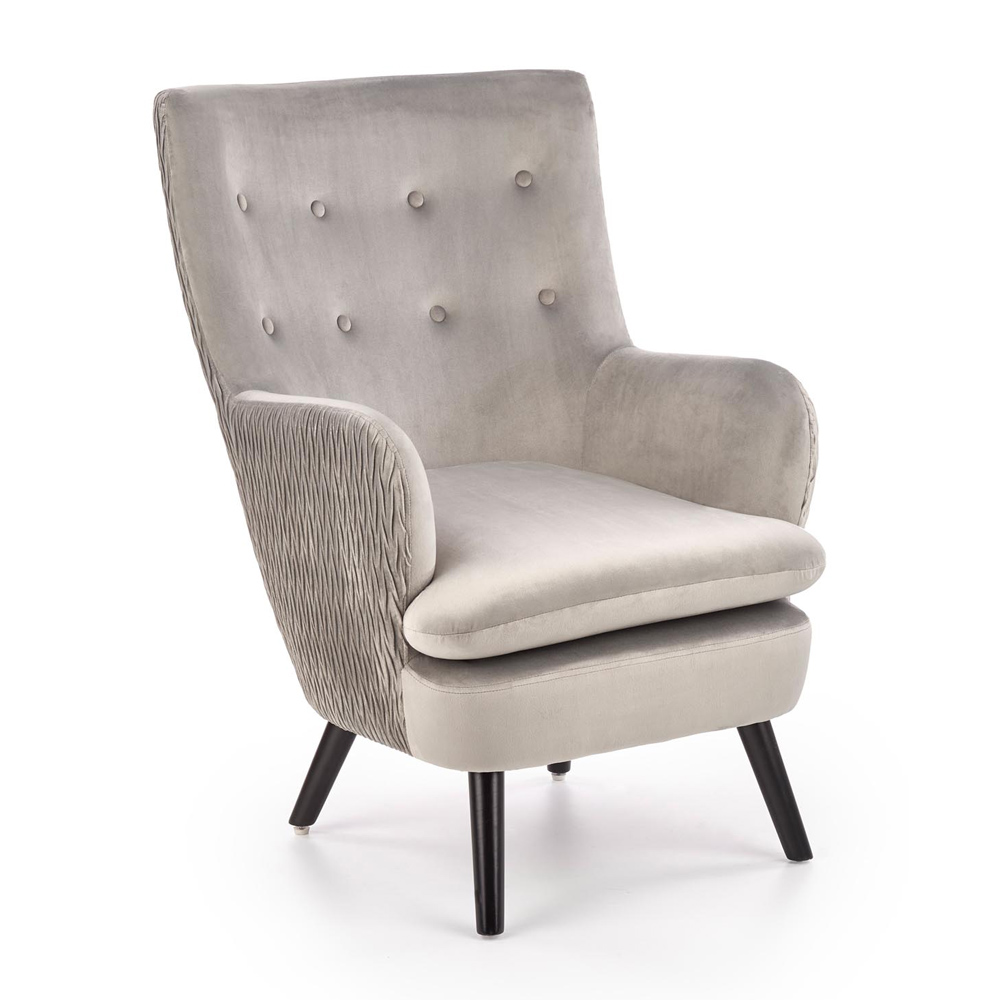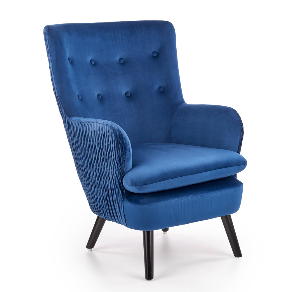 Елегантен фотьойл с дамаска от кадифе, широка облегалка, релефни страници и дървени крачета Primo, който се предлага с тапицерия в четири различни цвята – зелен, син, сив или бордо.