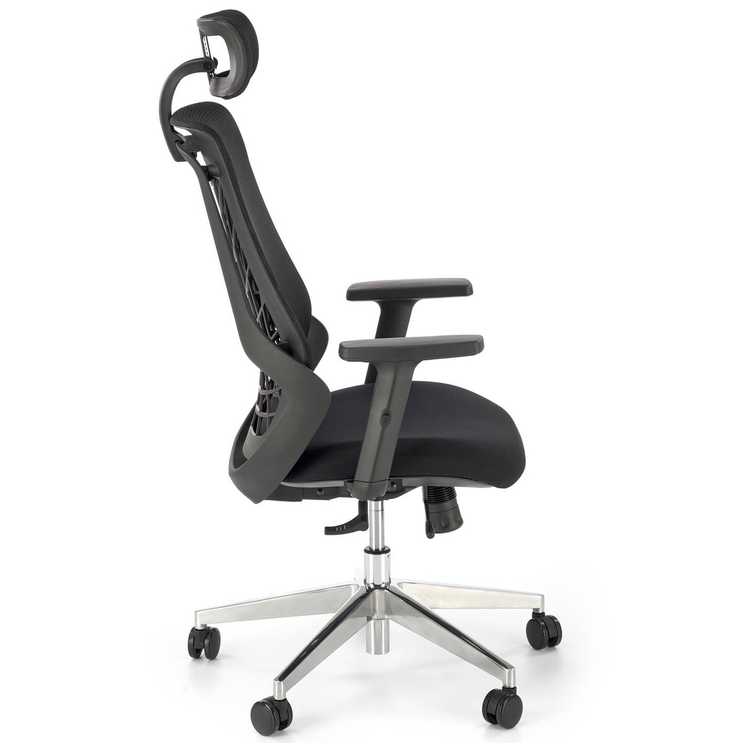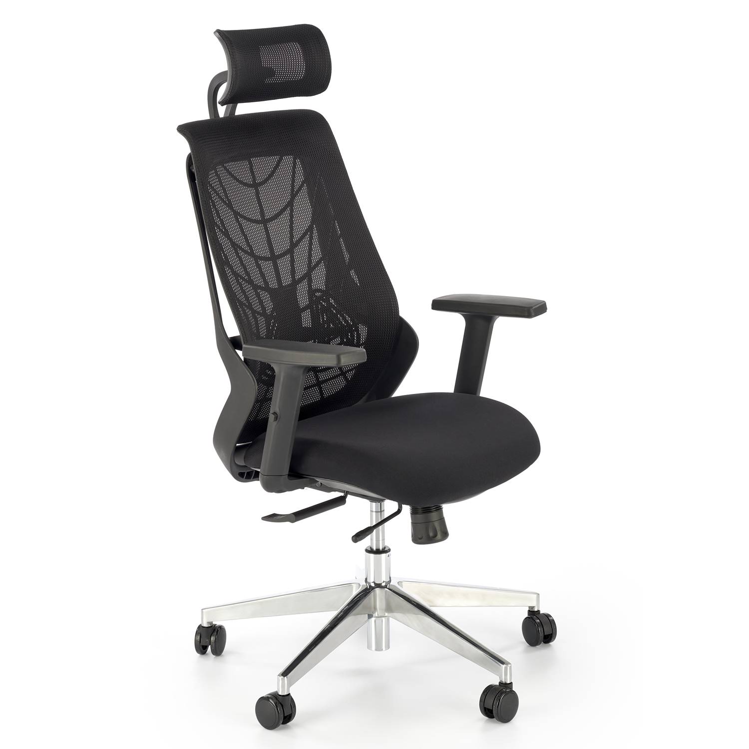 Ергономичен офис стол, изрботен с мембранова дамаска в черен цвят и алуминиева основа на колелца, Geronimo.