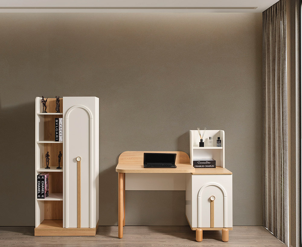 Етажерка с 5 рафта и шкаф с вратичка Gonca е функционална мебел с изчистен дизайн, предназначена за организиране и съхранение на книги, пособия и аксесоари в дома или детската стая.