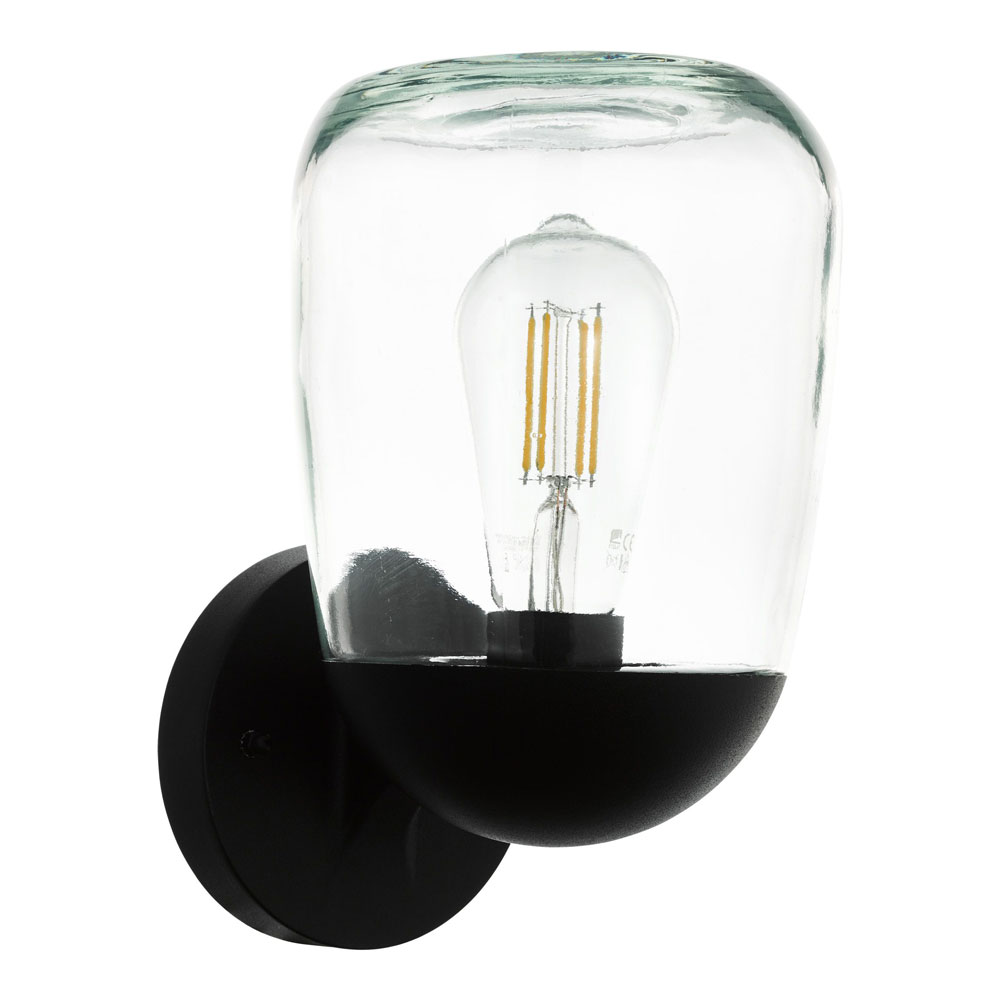 Фасаден аплик с кръгла основа от черен метал и овално тяло от прозрачно стъкло Eglo, серия Donatori.