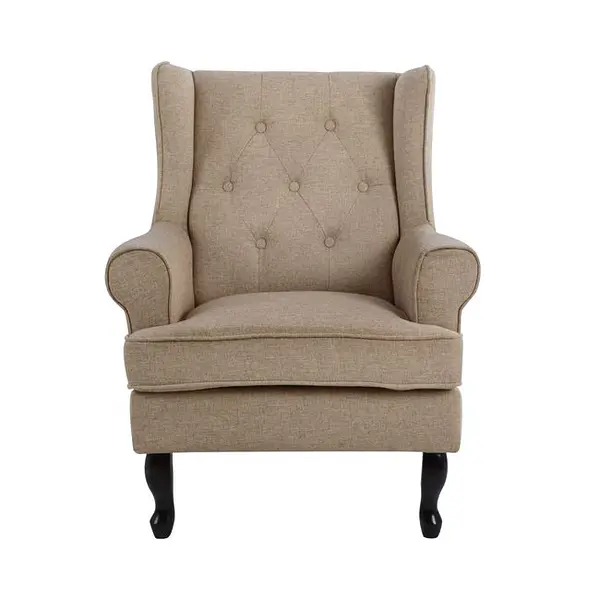 Този стилен фотьойл с подлакътници е изработен с текстилна дамаска, декоративни копчета на облегалката, мека възглавничка и подсилени дървени крака в тъмен нюанс.