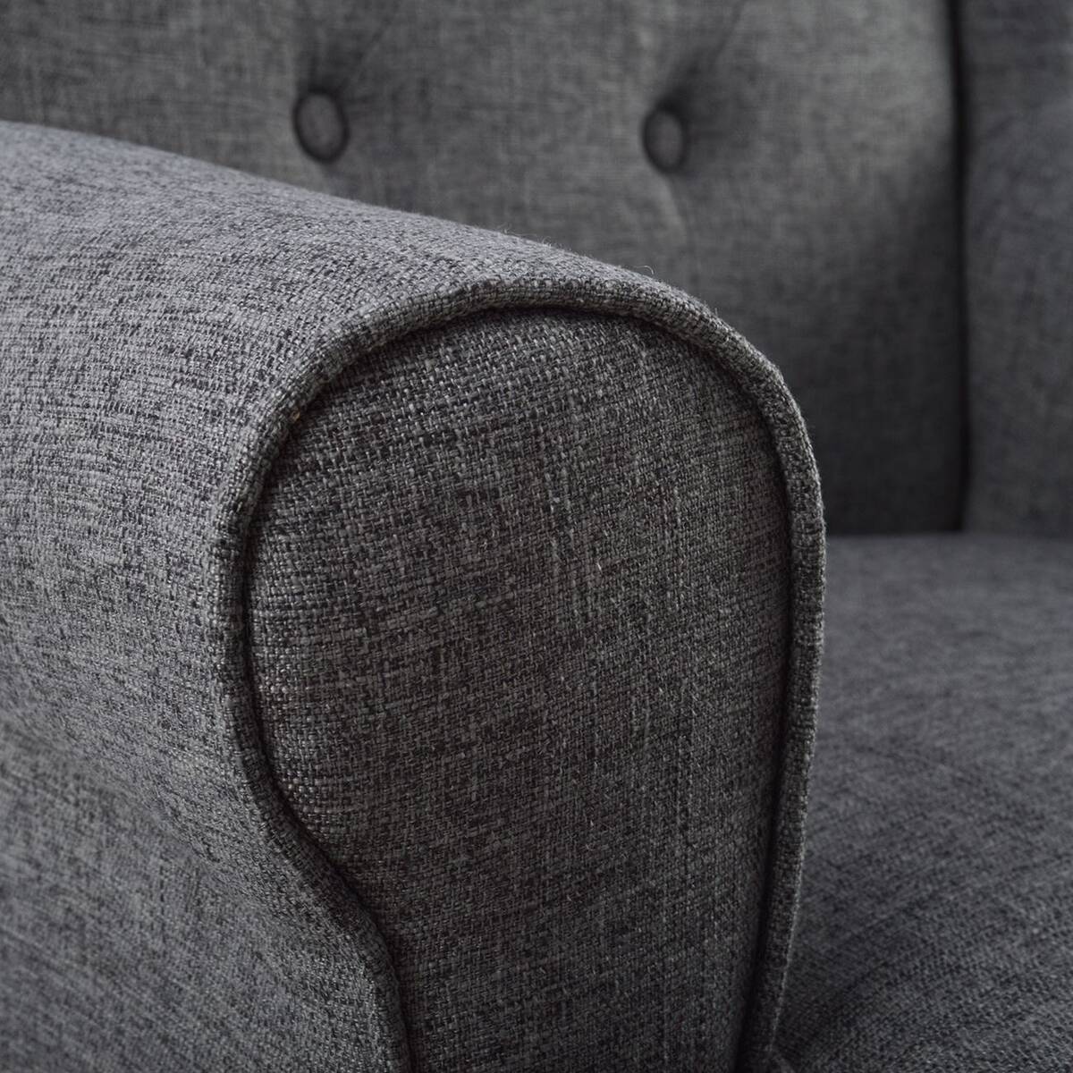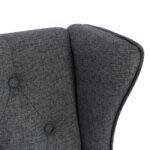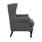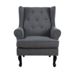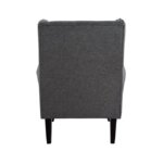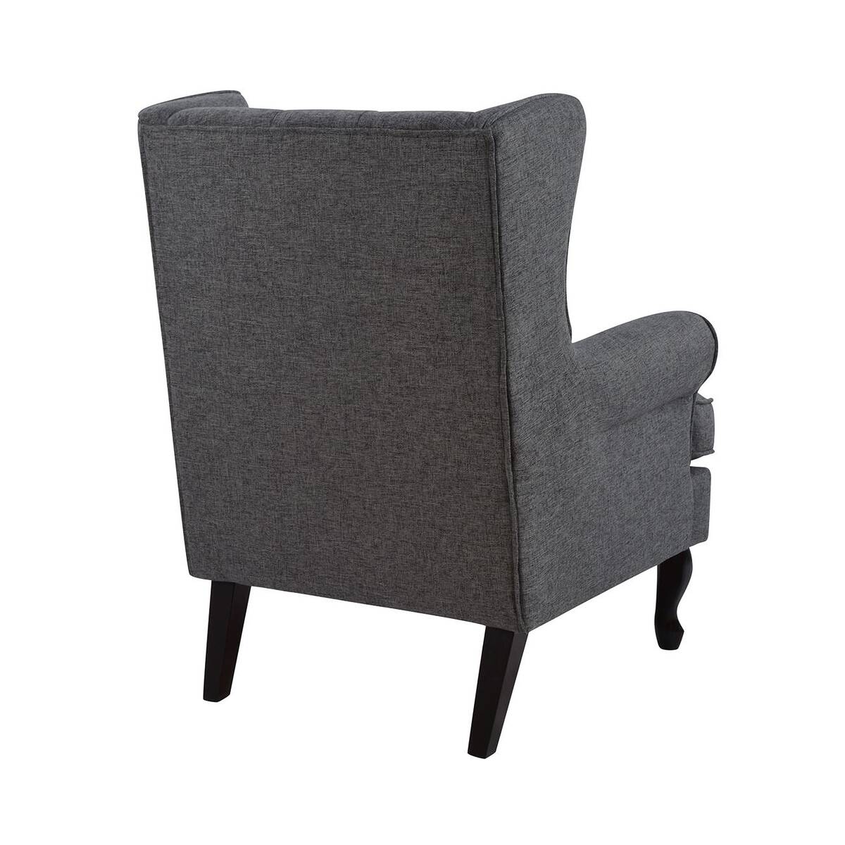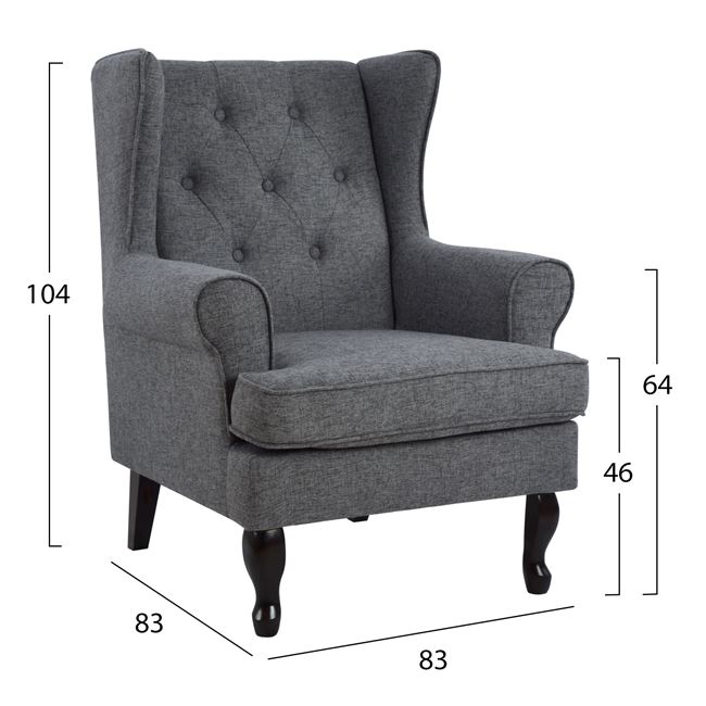 Този стилен фотьойл с подлакътници е изработен с текстилна дамаска, декоративни копчета на облегалката, мека възглавничка и подсилени дървени крака в тъмен нюанс.