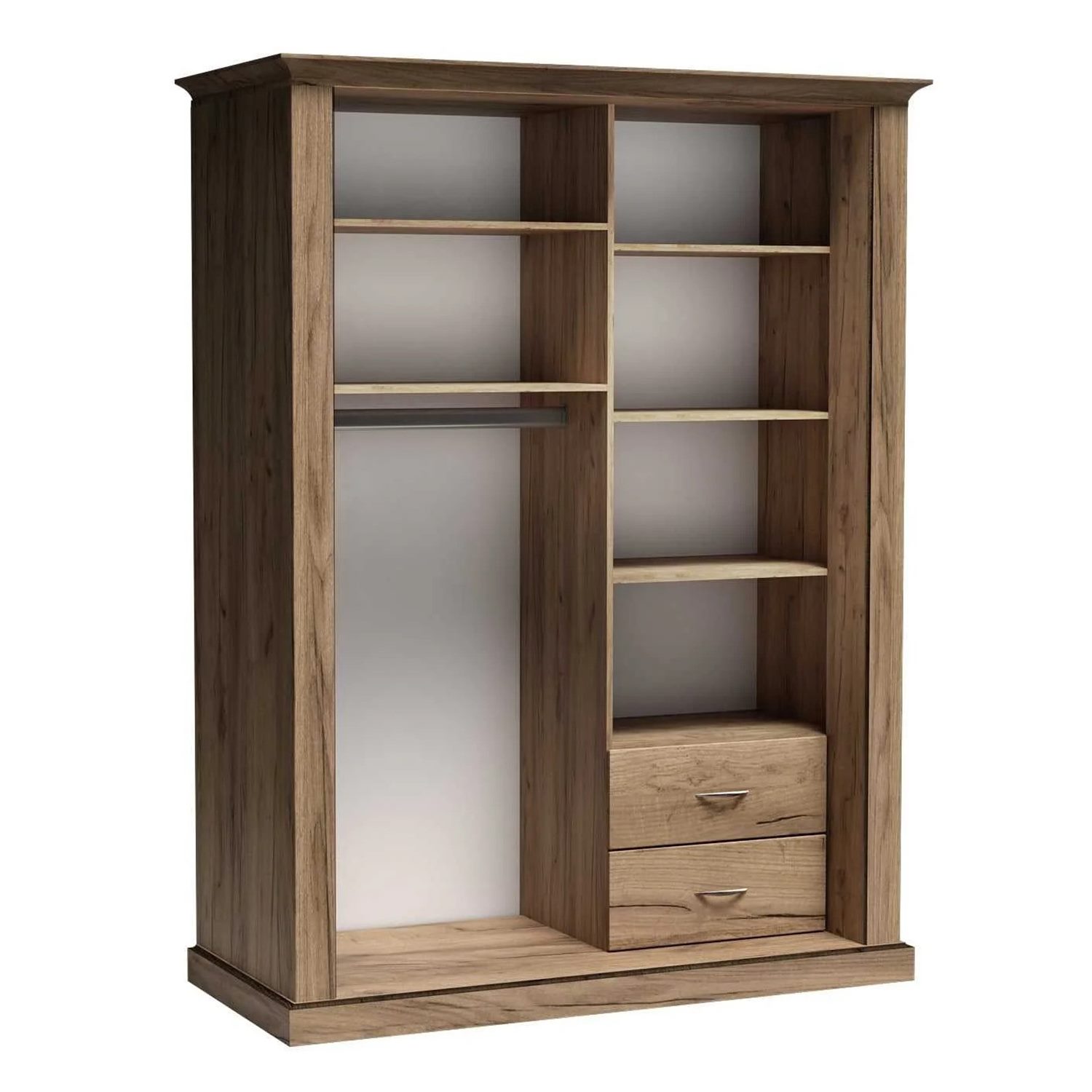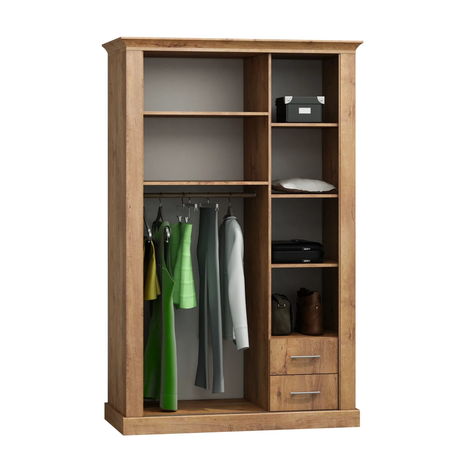 Вътрешното пространство е умело организирано с две чекмеджета, пет рафта и лост за дрехи, което позволява оптимално използване и лесно подреждане на всички ваши вещи.