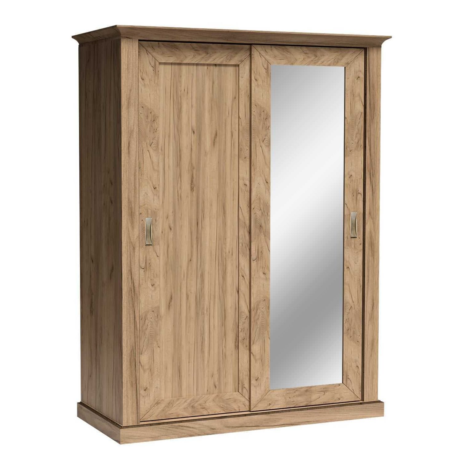 Огледалният фронт визуално разширява и осветлява помещението, а плъзгащите се врати улесняват достъпа дори в по-тесни пространства. Металните дръжки добавят изискан акцент, а здравият корпус в топъл дървесен тон гарантира стабилност и дълготрайност.