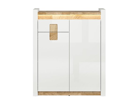 Гланциран шкаф за антре, изработен от МДФ и ПДЧ в бял цвят с детайли в цвят уестминстърски дъб, чекмедже, две вратички и LED осветление под плота, модулна система Аламеда.