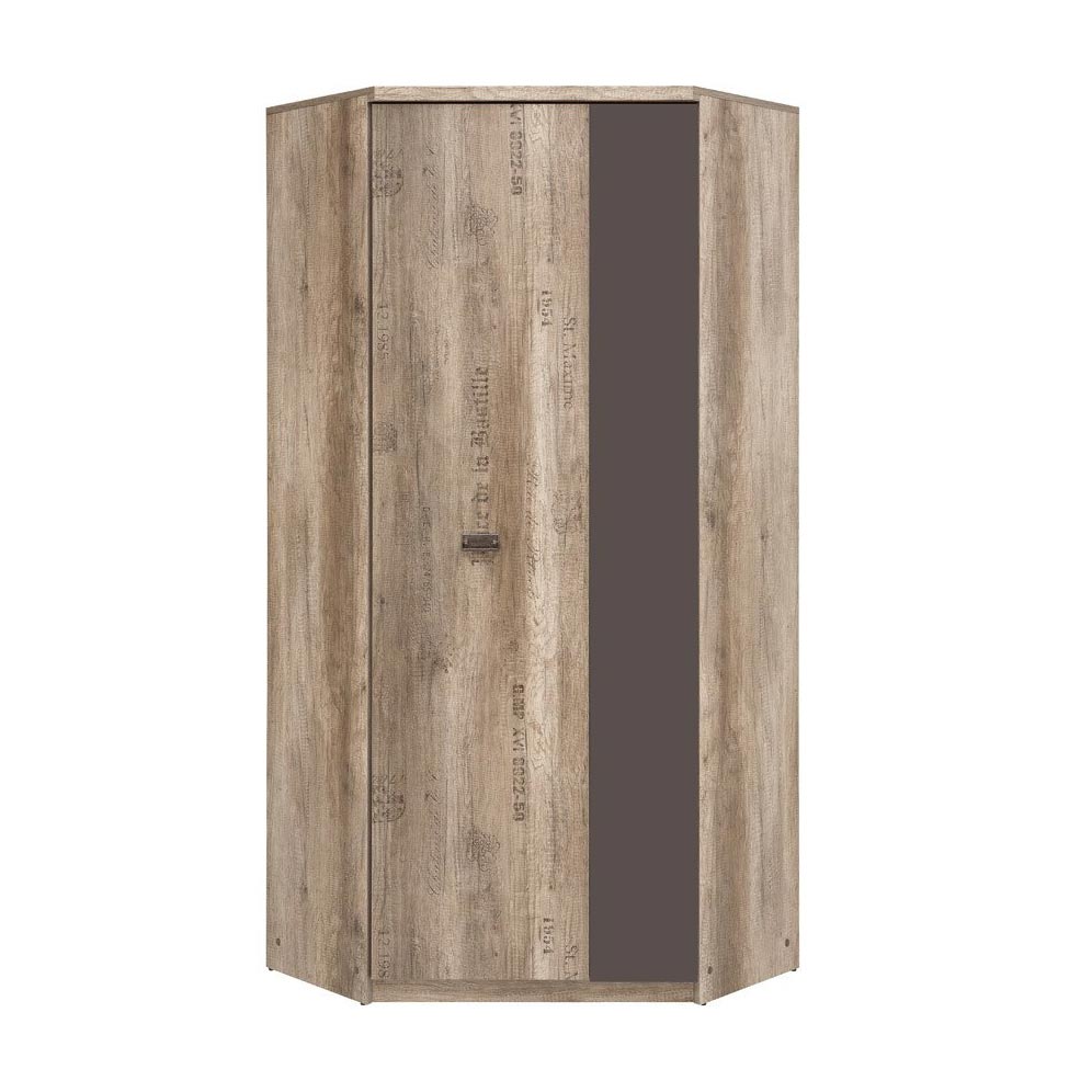 Голям ъглов гардероб в дървесен цвят дъб каньон монумент със старинни надписи, акцент в сиво и дръжка в цвят античен никел, модулна система Малкълм.