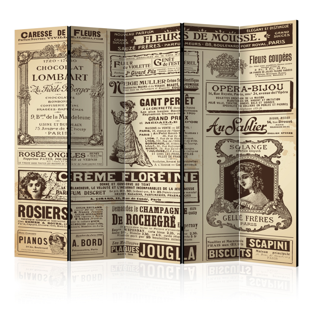 Този голям интериорен параван с винтиндж мотив е оригинална декорация за всеки съвременен интериор. Състои се от 3 или 5 части, изработен е от дърво и е с двустранен печат. Благодарение на оригиналния мотив на стар френски вестник, с качество на печата Full HD, този параван ще придаде неповторим чар на всяко помещение у дома!
